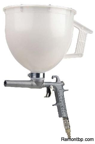 - После нанесения клея, не теряя ни минуты, наносится флок путем его распыления флоковым пистолетом или специальным компрессором. О любых подручных средствах (пылесосы, вентиляторы и т.д.) не может быть и речи. Лучше всего работать с напарником: один мастер наносит клей, другой занимается напылением.