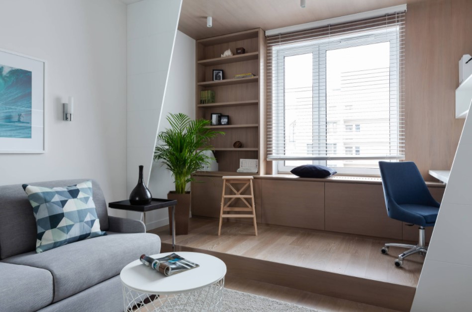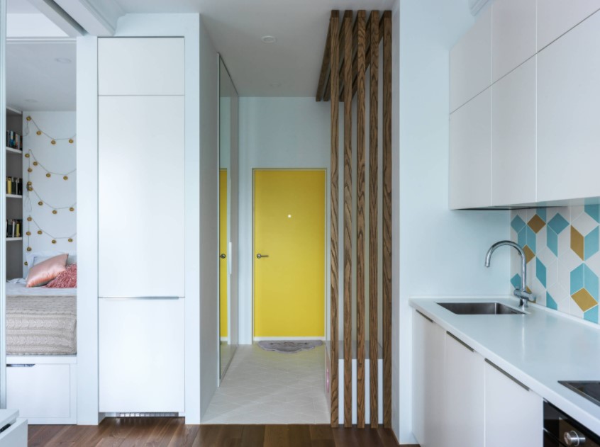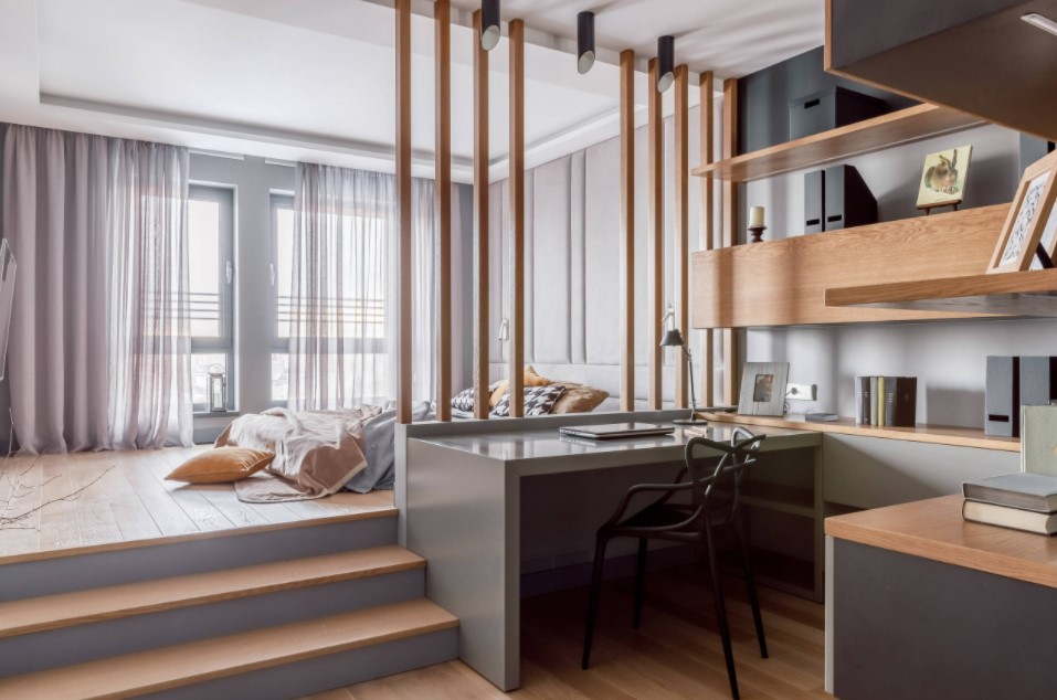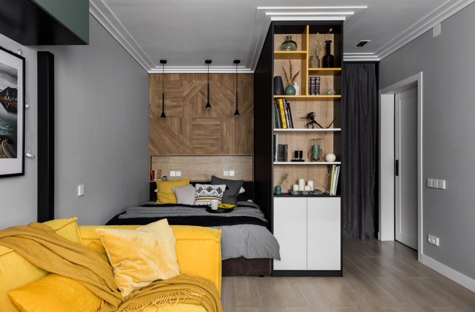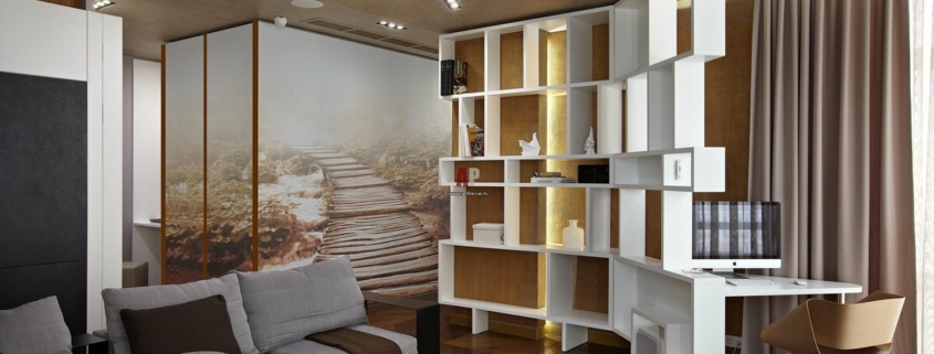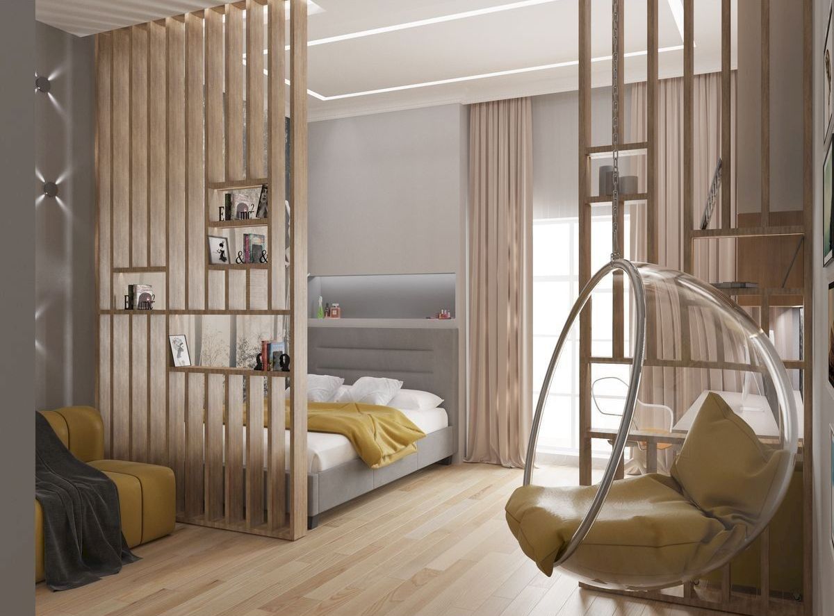 Зонировать пространство при помощи различного вида перегородок можно не только имея в наличие помещение с большой площадью. Кроме того, как показывает практика, иногда миниатюрные комнаты гораздо больше нуждаются в таком дизайнерском подходе.