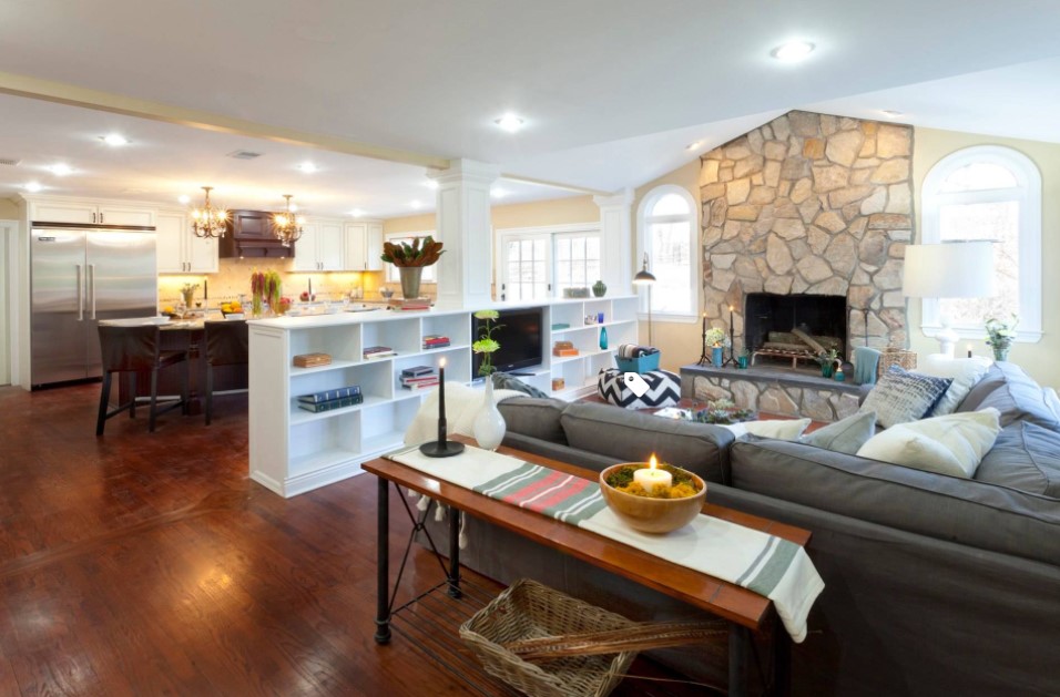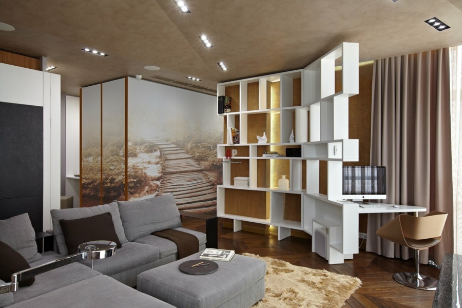 Декоративные конструкции такого плана, как вы понимаете представляют собой нечто среднее между мебелью и собственно самой перегородкой. Иными словами, вы разделяете пространство на зоны при помощи вместительного шкафа с множеством полочек и отсеков для хранения. Такие модели перегородок могут изготавливаться в разных размерах, быть полностью закрытыми либо украшаться витринами, представлять собой цельную конструкцию либо состоять из модульных элементов.