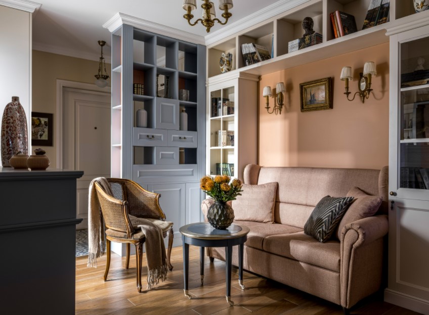 Декоративные перегородки по типу стеллажей отличаются практичностью. С одной стороны, при помощи подобной конструкции можно прекрасно разделить помещение на функциональные зоны. А с другой – использовать стеллаж как дополнительную систему хранения, которую при желании либо необходимости можно переместить в другое место. Здесь можно расположить цветы в горшках либо красивый сервиз, книги, фотографии в рамочках или статуэтки. Всё зависит от того какую именно атмосферу вы желаете создать. Многие дизайнеры считают подобные конструкции незаменимыми для обустройства мини-кабинета.
