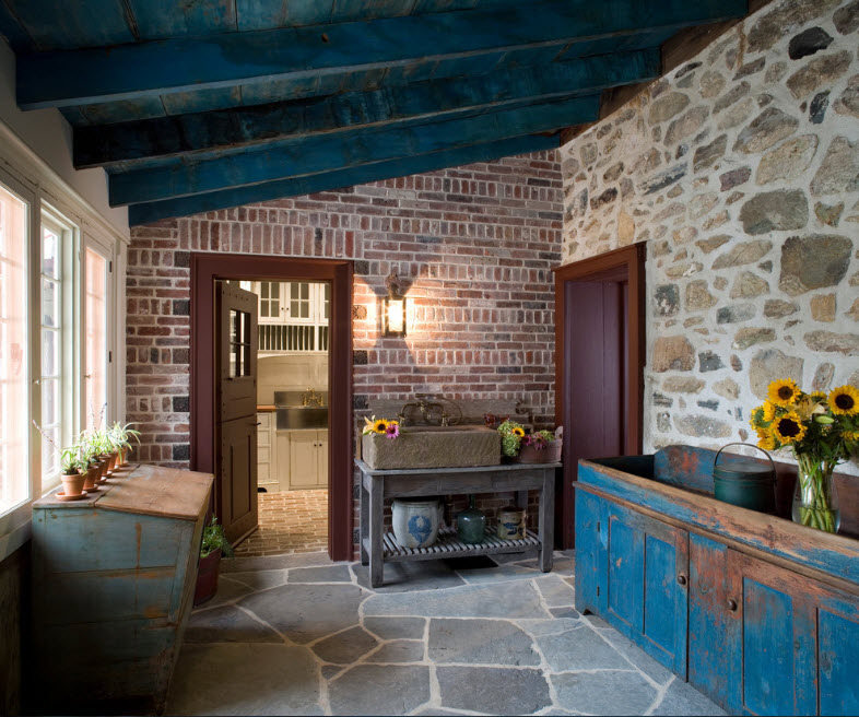 Оригинальным дизайнерским приемом для оформления утилитарных помещений является использование гальки или речного камня. При этом камень с галкой поверхностью может быть использован как в качестве декоративного элемента (небольших вставок в отделке стен или оформлении напольного покрытия), так и в виде основного отделочного материала (вариант для просторных помещений с хорошей освещенностью).