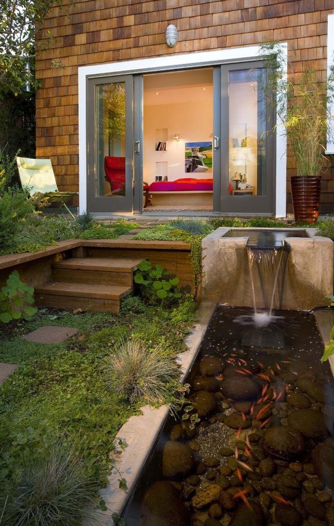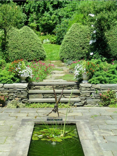 Такое решение декоративного водоема наименее трудоемко как в изготовлении, так и в обслуживании. Предварительно спустив воду, емкость очень легко чистить от грязи, а прочные бортики не позволят осыпаться грунту.