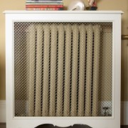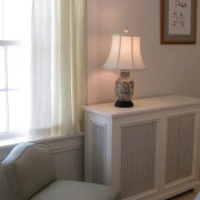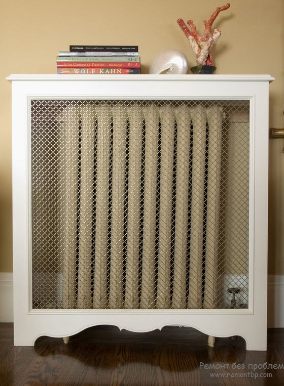 Батареи можно задекорировать под камин или тумбу. Для того, чтобы спрятанная батарея не потеряла своей основной функции – обогрева помещения, переднюю стенку можно сделать из ажурной фанеры, через отверстия которой будет поступать тепло в помещение.