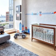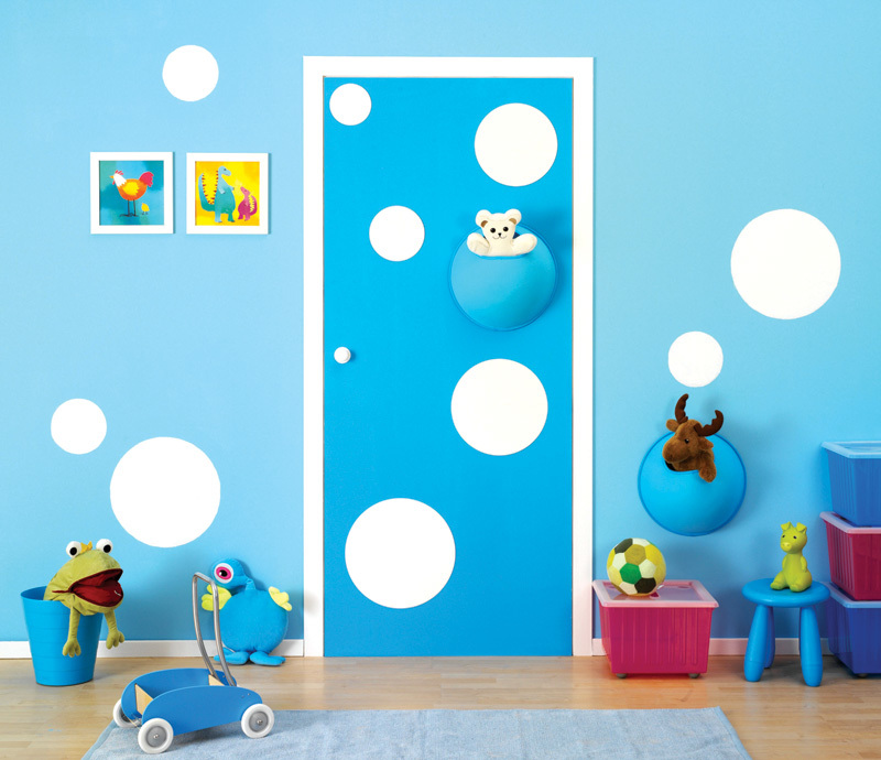 Старые двери не должны быть просто фоном без выражения, если вы раскрасите их в теплые цвета и геометрические фигуры, развив воображение, то привнесете в детскую веселое настроение. Благодаря готовым шаблонам украшение двери будет легким и не повлияет на состояние вашего домашнего бюджета. Попробуйте на фоне бирюзовой стены и двери нарисовать разного размера белые горошины, которые превратят простое полотно ее в интригующее украшение. Для достижения трехмерного эффекта наклейте на дверь деталь из готовых шаблонов листа ПВХ.