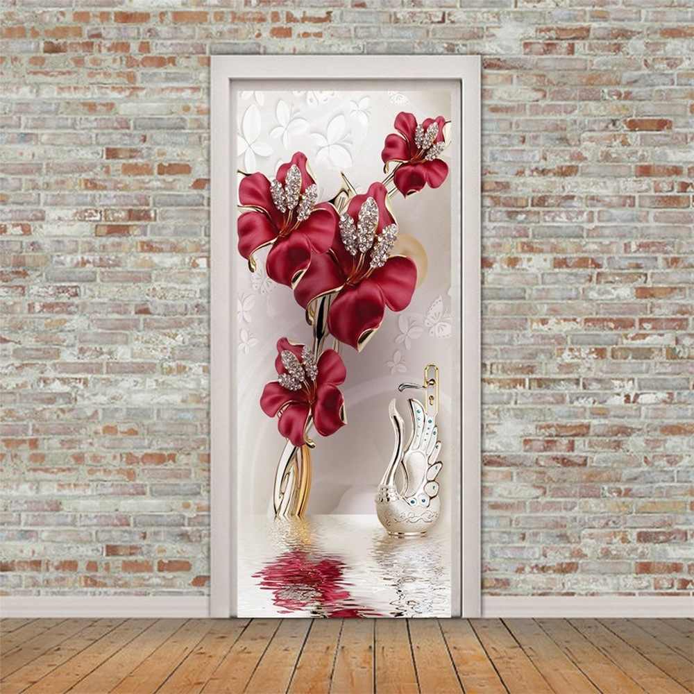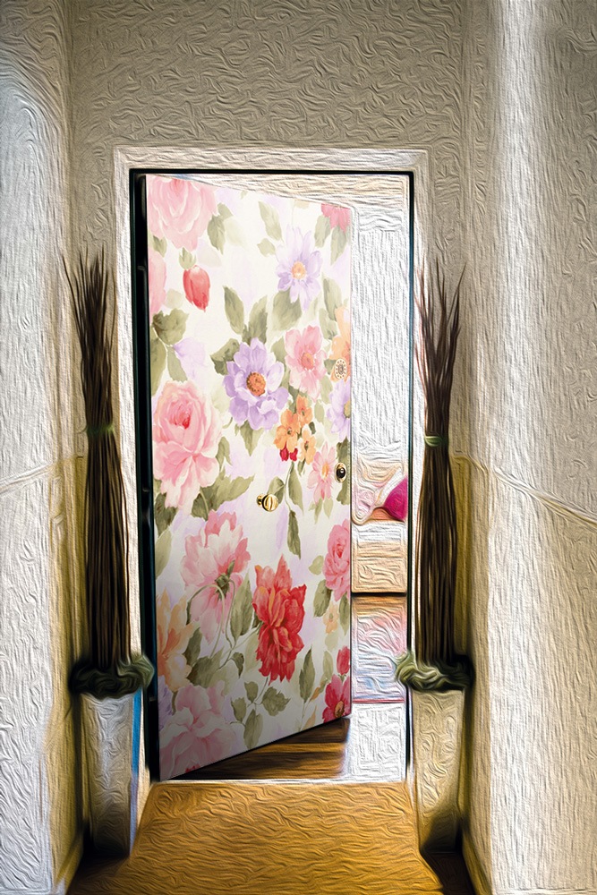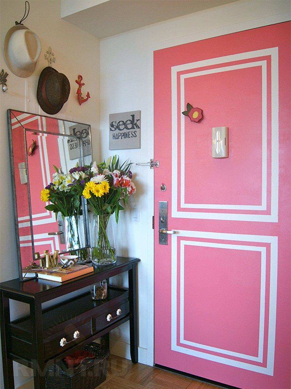 Внутренняя дверь, украшенная узорчатой тканью с цветочными мотивами, — это экстравагантная идея обустройства комнаты. Ее можно обогатить изображениями с похожим или одинаковым рисунком. Эта процедура сделает интерьер уникальным, а дверь, рамку которой выкрасите в розовый цвет, будет похожа на картину.