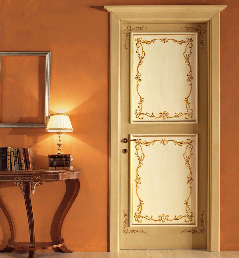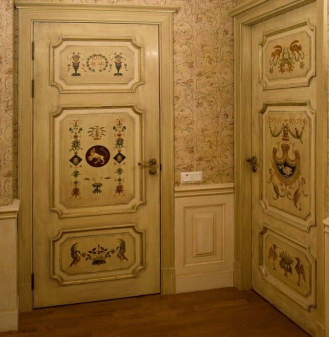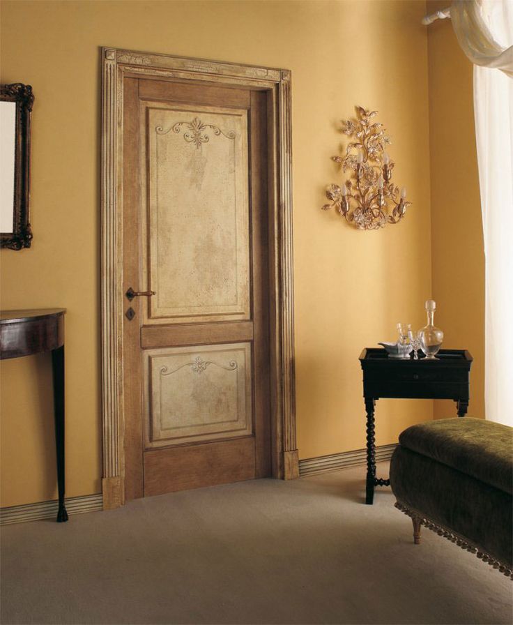 Простые украшения делают обычные деревянные двери элегантными и стильными. Благодаря обоям они приобретут текстуру, напоминающую старую, слегка протертую поверхность. Украшение дверей лепниной сделает их одним из самых важных предметов интерьера. Украшения очень легко монтируются и дают потрясающий эффект.