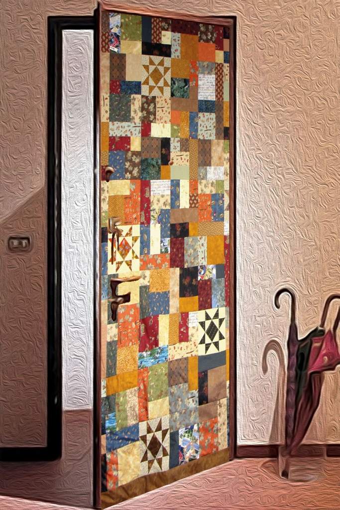 - Снимите защитную бумагу с ленты и приклейте ткань к створке двери. Затем прикрепите дверные ручки.