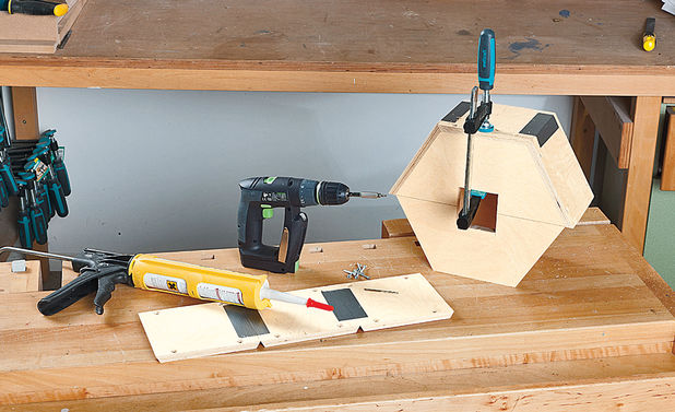 Также вырезаем боковые стороны в количестве шесть штук. Три из них складываем между собой и фиксируем скотчем с лицевой стороны. Наносим клей на канавки по внутренней стороне, а также на три боковые стороны двух шестигранников. Соединяем детали между собой, фиксируем тисками и шурупами. По тому же принципу прикрепляем остальные части.