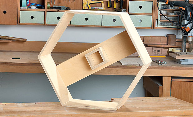 Исходя из размеров внутренней части верха шестиугольной заготовки, вырезаем крышку такой же формы. По центру делаем небольшое отверстие и немного не до конца ввинчиваем шуруп. По внутренней стороне наносим клей.