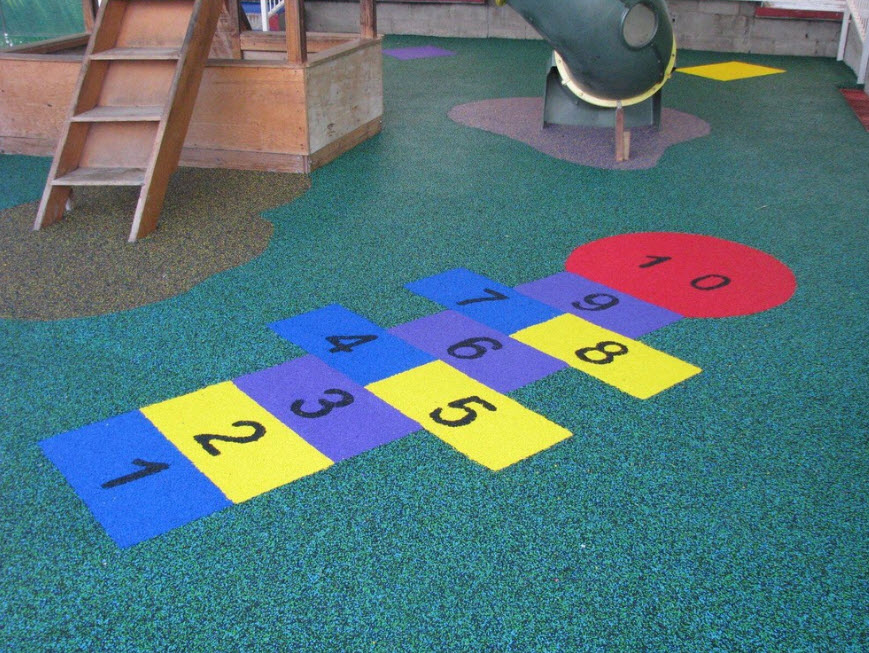 Резиновая плитка. Вы могли видеть подобное покрытие на многих городских игровых площадках. Это наиболее практичный и долговечный вариант искусственного настила для игровой зоны. Материал покрытия немного пружинит, что позволяет свести к минимуму последствия от падений и ударов. За покрытием легко ухаживать, оно легко моется, быстро сохнет, способно пропускать влагу. Укладку плитки можно производить на любой поверхности (даже на грунте), быстро и просто. Материал обладает высокой износостойкостью и долговечностью при правильной эксплуатации. Выпускается плитка разных цветов, с различными изображениями. В итоге резиновое покрытие можно использовать не только в качестве защитного слоя, но и элементов для игр, изучения цветов и форм.