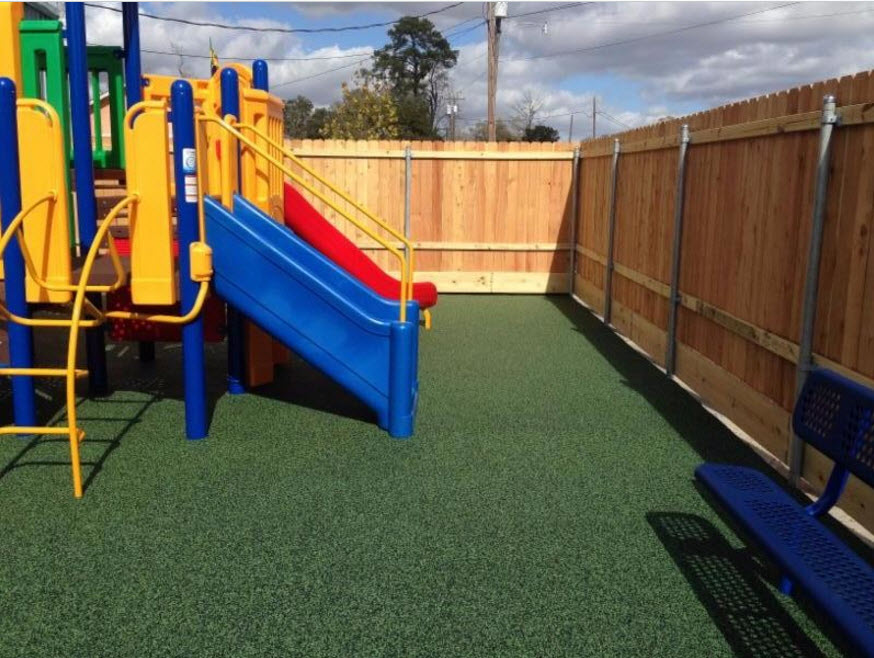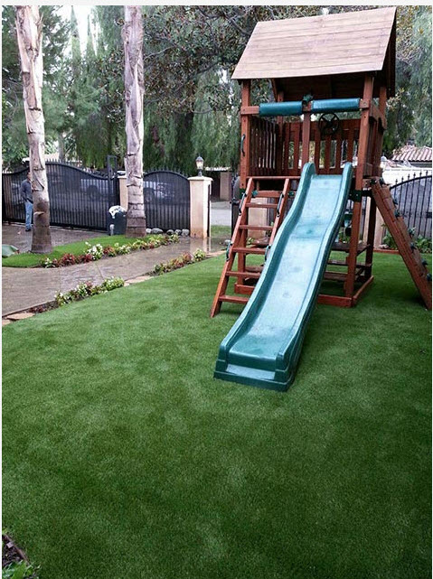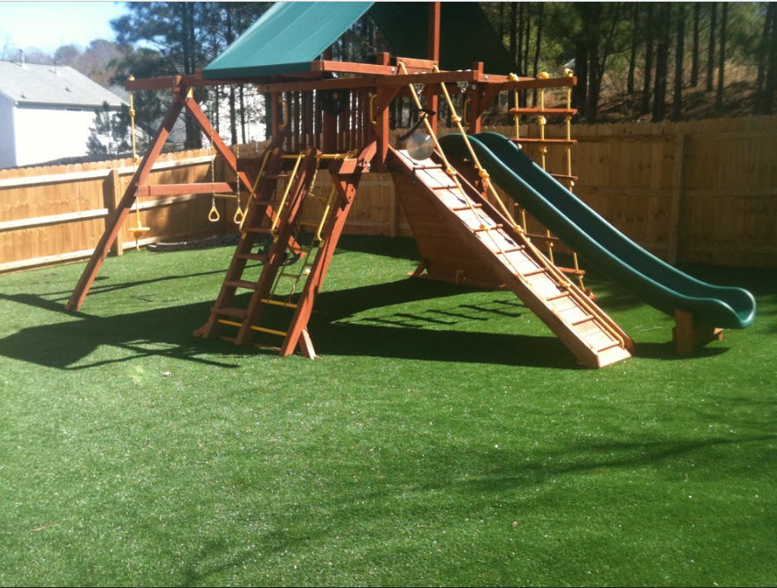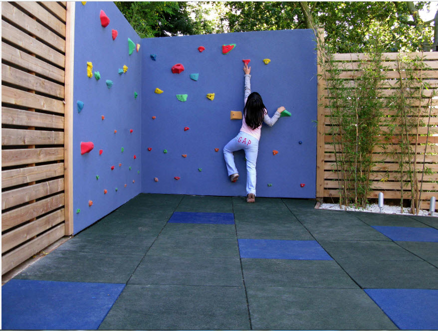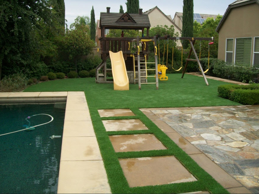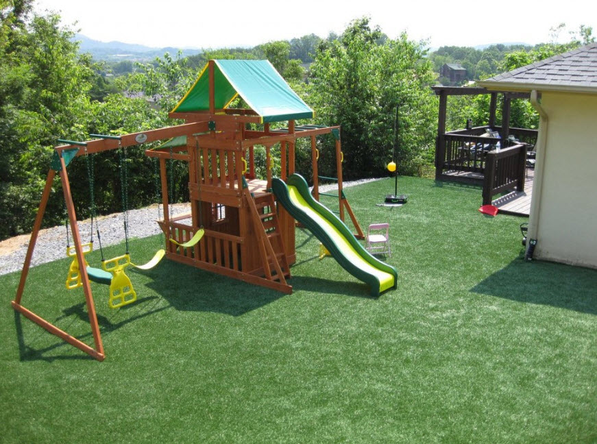 Искусственный газон. Это рулонный материал с эластичной основой. Искусственная трава отлично имитирует природное покрытие. Но ее не нужно поливать и подстригать. После дождя такое покрытие достаточно быстро высыхает. Искусственный газон смягчает удары от падений не так хорошо, как песок или натуральная трава, зато он обладает высокой износостойкостью, долговечность, не вытаптывается и легко моется. Такой газон не пачкает одежду, не прилипает к телу, но стоит довольно дорого. При выборе искусственного покрытия, учитывайте не только высоту «травинок», но и их плотность – газон не должен стеснять движения ребенка. Как правило, искусственный газон укладывают на бетонную основу.