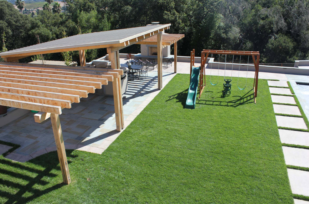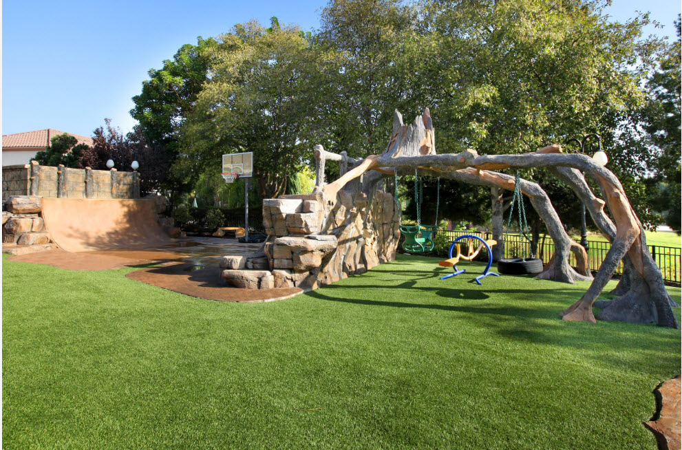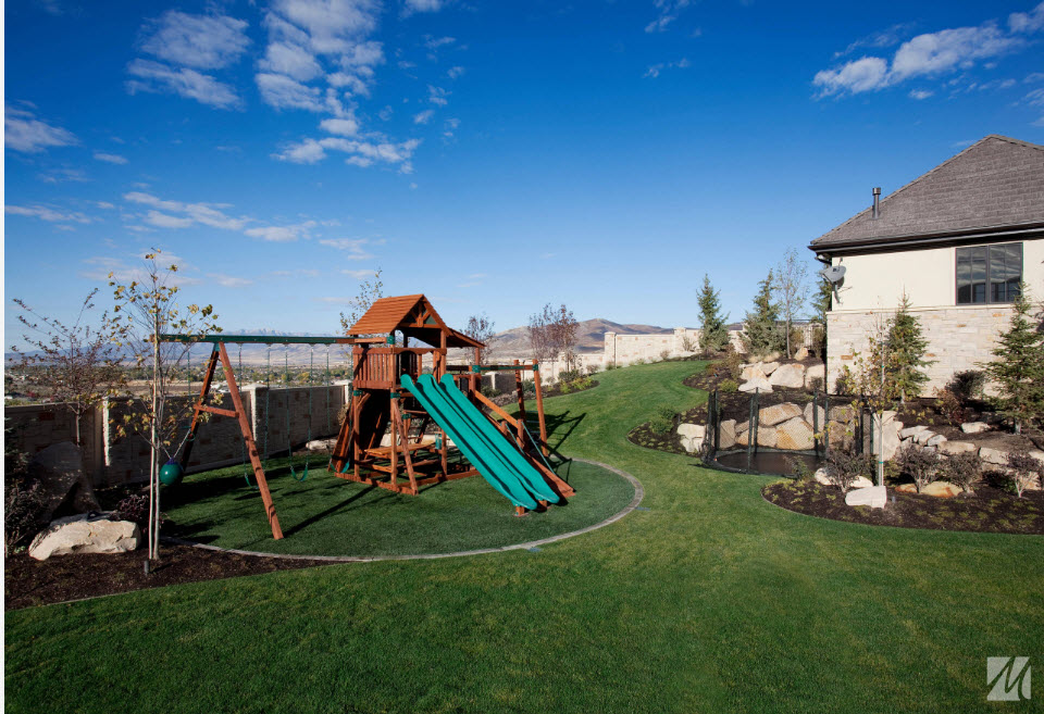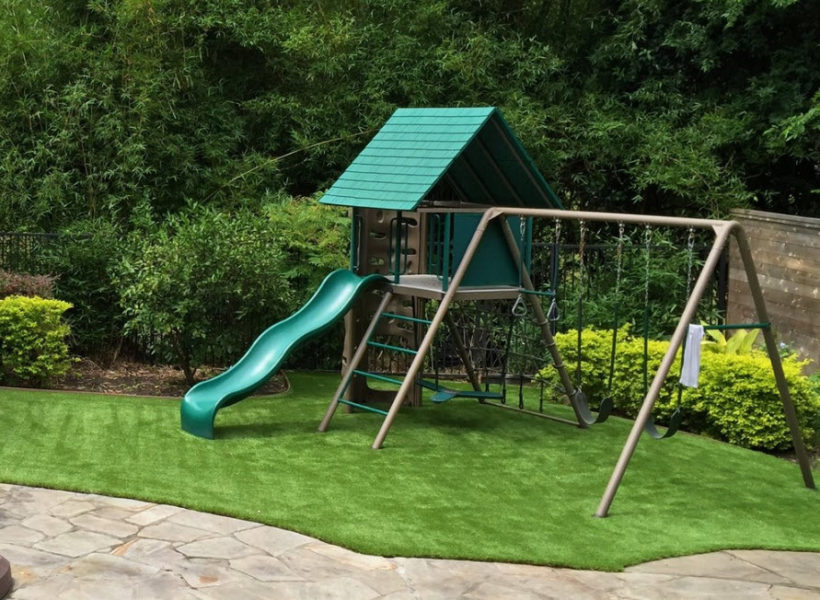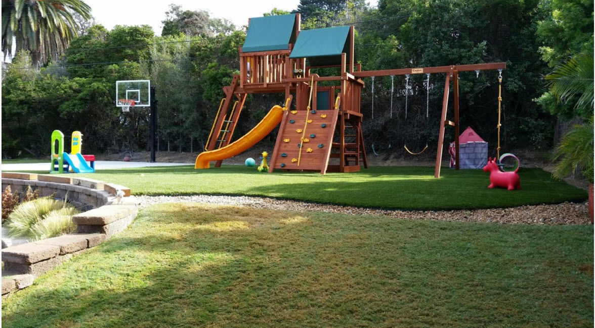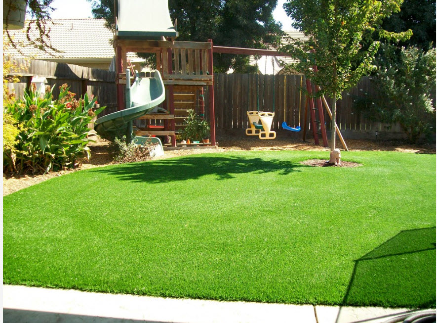 Искусственный газон. Это рулонный материал с эластичной основой. Искусственная трава отлично имитирует природное покрытие. Но ее не нужно поливать и подстригать. После дождя такое покрытие достаточно быстро высыхает. Искусственный газон смягчает удары от падений не так хорошо, как песок или натуральная трава, зато он обладает высокой износостойкостью, долговечность, не вытаптывается и легко моется. Такой газон не пачкает одежду, не прилипает к телу, но стоит довольно дорого. При выборе искусственного покрытия, учитывайте не только высоту «травинок», но и их плотность – газон не должен стеснять движения ребенка. Как правило, искусственный газон укладывают на бетонную основу.