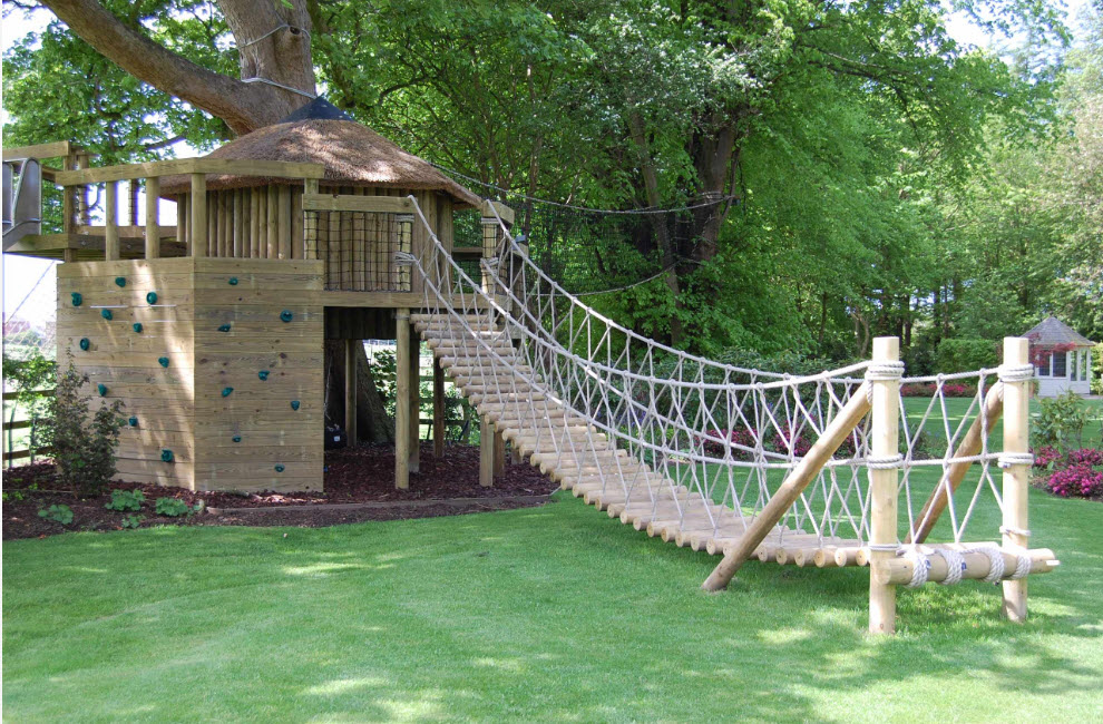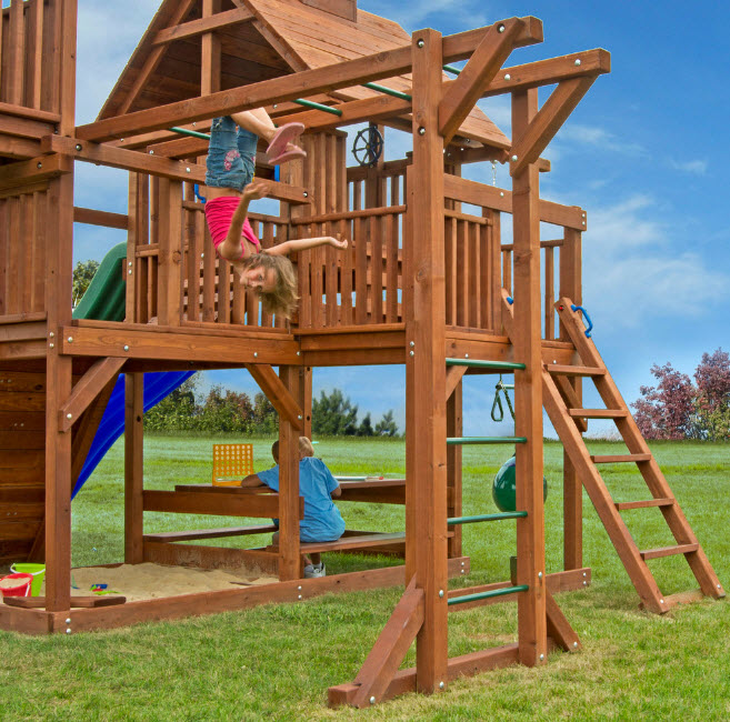 Дерево. Крупные производители готовых решений для детских площадок используют именно дерево для исполнения основных элементов своих конструкций. Металл или пластик выступают лишь в качестве дополнительного сырья (чаще всего для производства горок, спиралей). Натуральный, прочный, долговечный и безопасный материал легко вписывается в любое оформление ландшафтного дизайна дачного участка или частного двора. Но и стоят игровые комплексы из натуральной древесины недешево