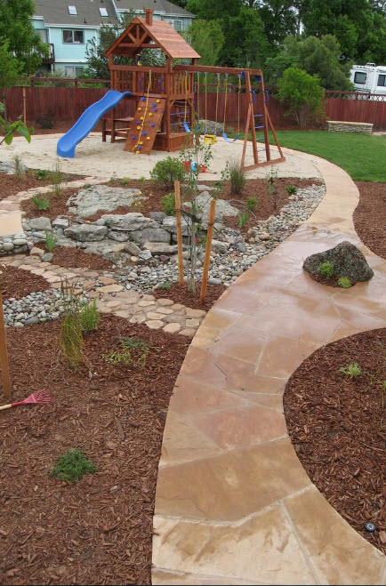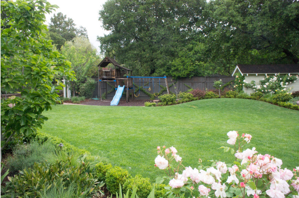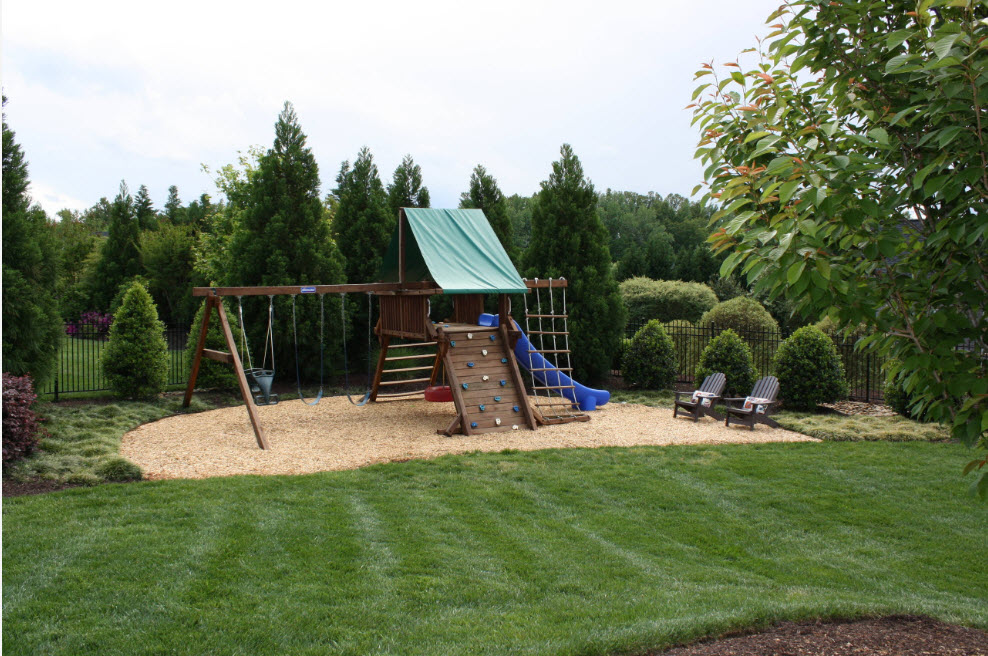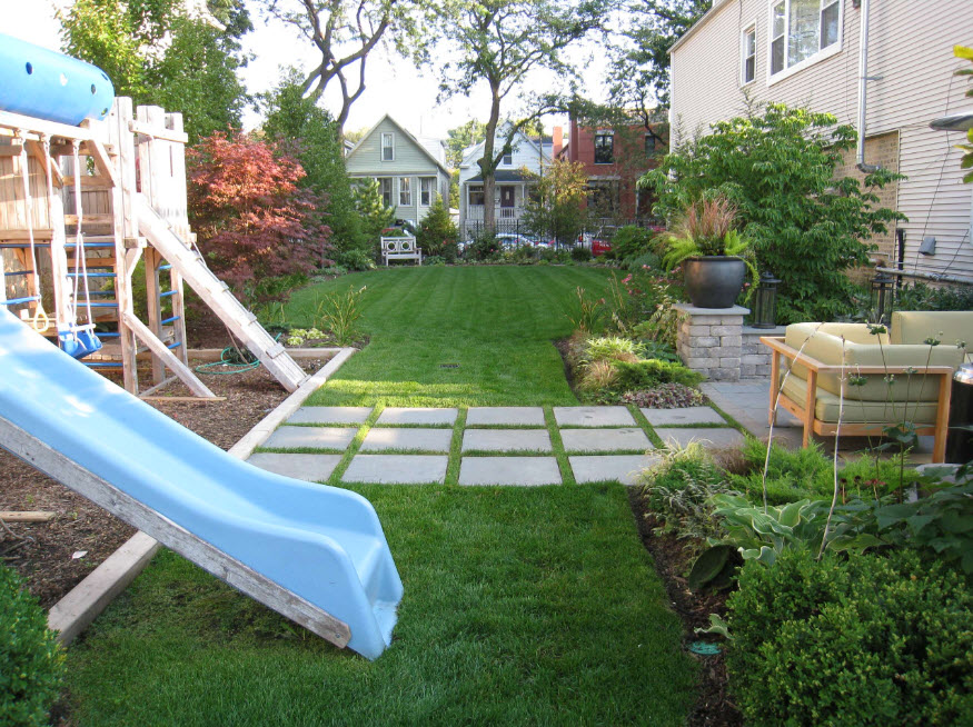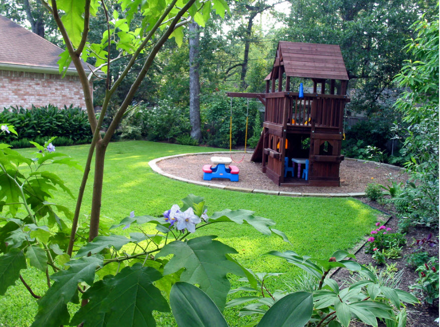 Газон. Что может быть натуральнее и приятнее на ощупь, чем равномерно подстриженная травка. Выбирайте для посева сорт газонной травы, устойчивой к вытаптыванию и равномерной густотой всходов. Скорее всего детям захочется бегать на такой площадке босиком. Конечно, у такого покрытия есть свои недостатки – за равномерностью всходов необходимо следить и подсевать траву в местах вытаптывания. Газон необходимо своевременно поливать и подстригать. После того как прошел дождя, какое-то время на площадке нельзя будет играть – можно поскользнуться на влажной траве.