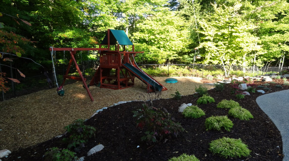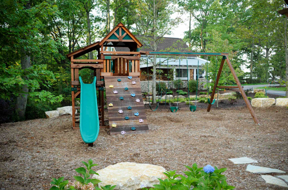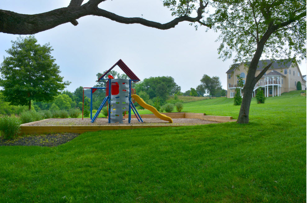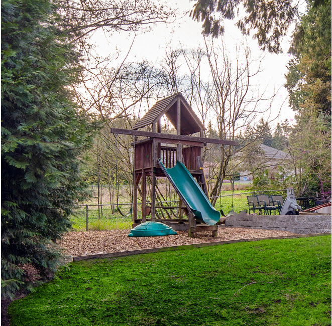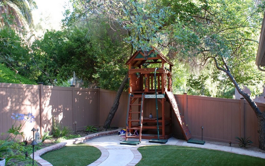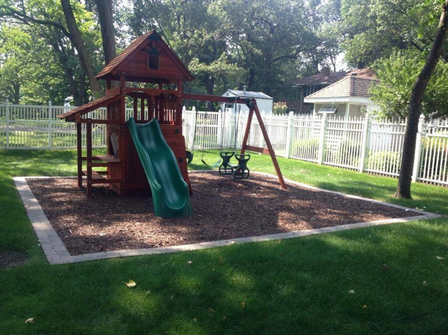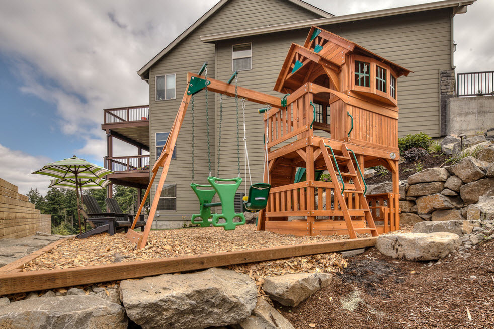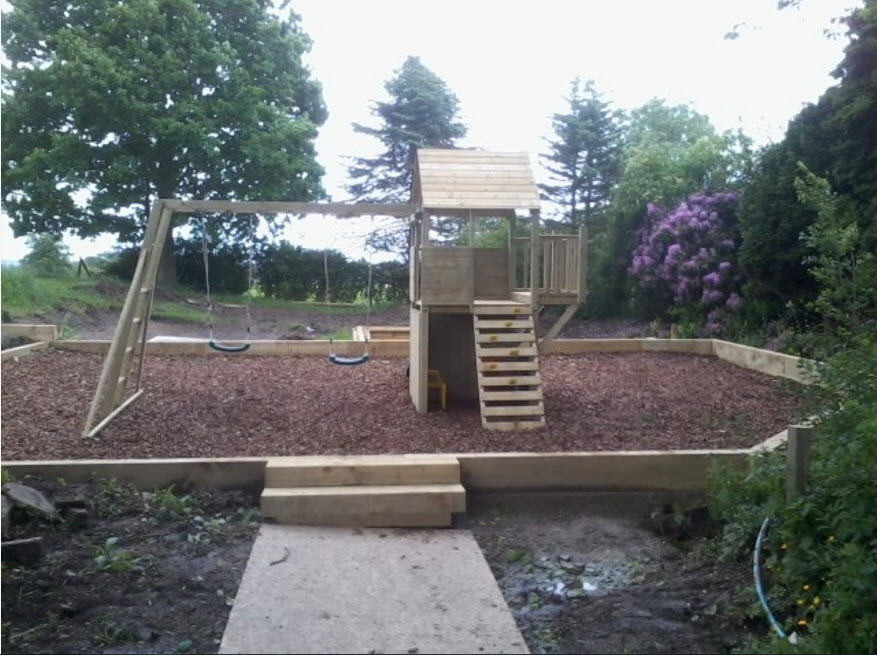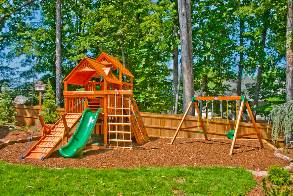 - площадку можно располагать вблизи основного здания или ограждении я участка, необходимо только учесть запасы расстояния на раскачивание качелей (если таковые имеются) и спуск с горки.