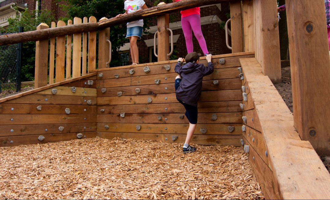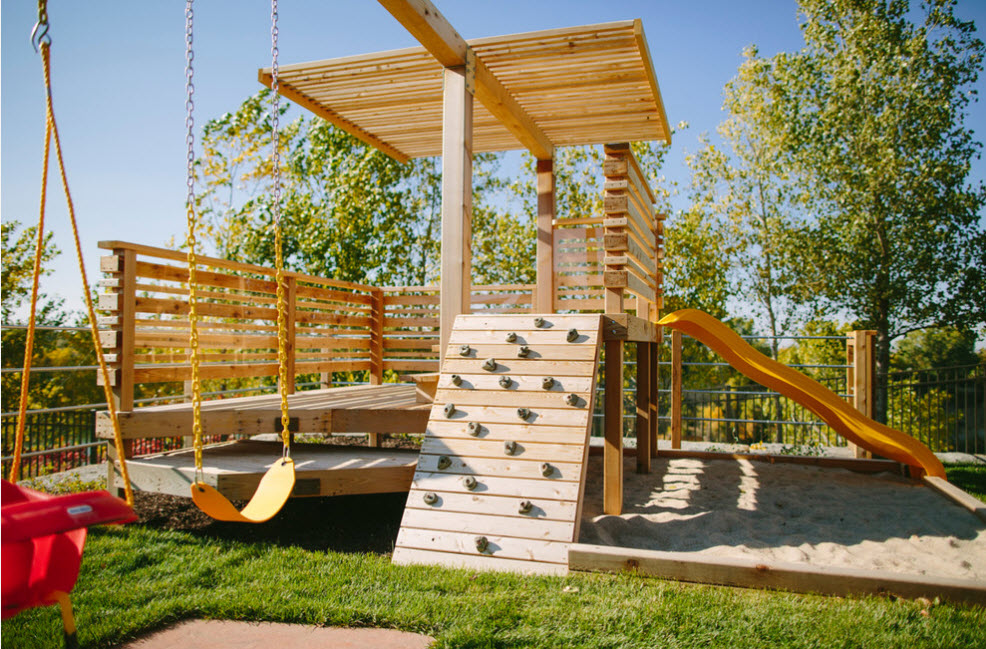- дошкольникам (примерно до 6-7 лет) нравятся качели разной модификации (подвесные и типа «весы»), горки, возможно, небольшой «скалодром» или наклонная поверхность с канатом для лазания, простые спортивные снаряды;