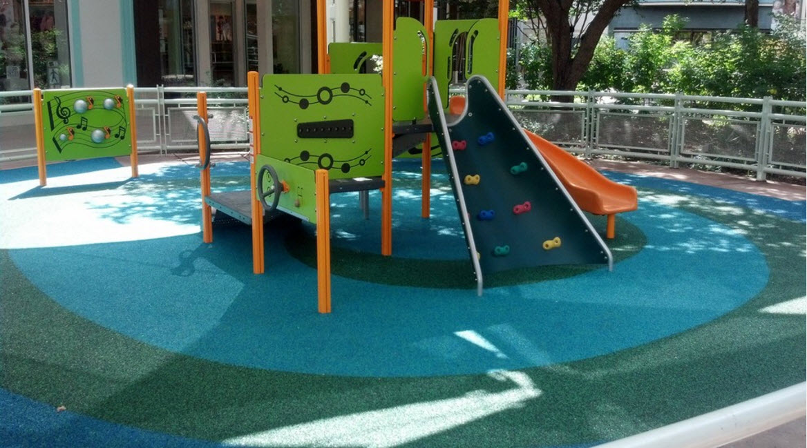 Наливное резиновое покрытие. Так же как и плитка, резиновое покрытие представляет собой смесь резиновой крошки и полиуретанового связующего. Но в отличие от плитки такой настил не имеет швов, а для его монтажа необходимо специальное оборудование. Поэтому в рамках частного жилища данный вид покрытия для детских площадок используется нечасто.