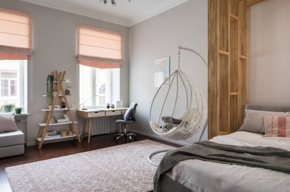 Размещение в детской комнате подвесной качели или кресла стало отличным дизайнерским решением.