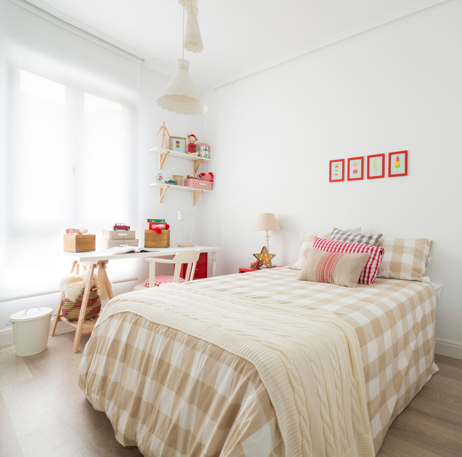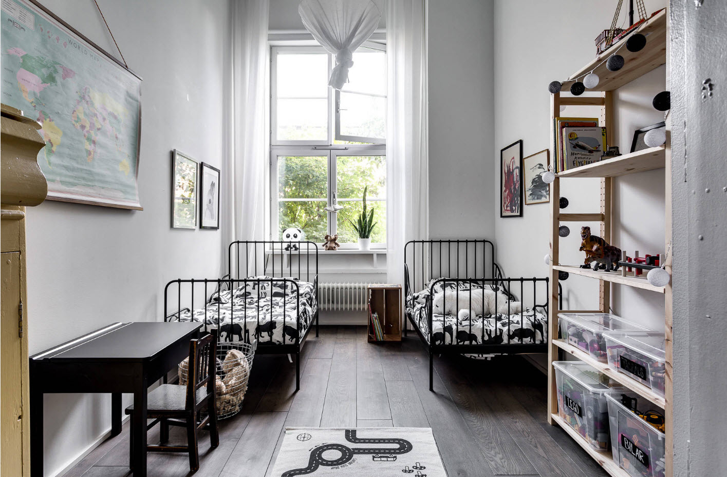 Скандинавский стиль с его любовью к белоснежной отделке подойдет для оформления комнаты для гиперактивного ребенка, которого яркие цвета могут побудить на еще большую активность и даже некоторую агрессию. Светлое помещение смотрится несколько прохладно, поэтому специалисты рекомендуют использовать древесины для привнесения не только цветового акцента, но и поднятия градуса характера интерьера. Кровать или системы хранения, письменный стол или мольберт для рисования, выполненные из светлой древесины, станут безопасным и гармоничным дополнением простого с точки зрения составления, но уютного по эмоциональным ощущениям, дизайна комнаты.