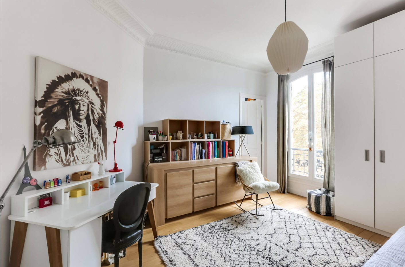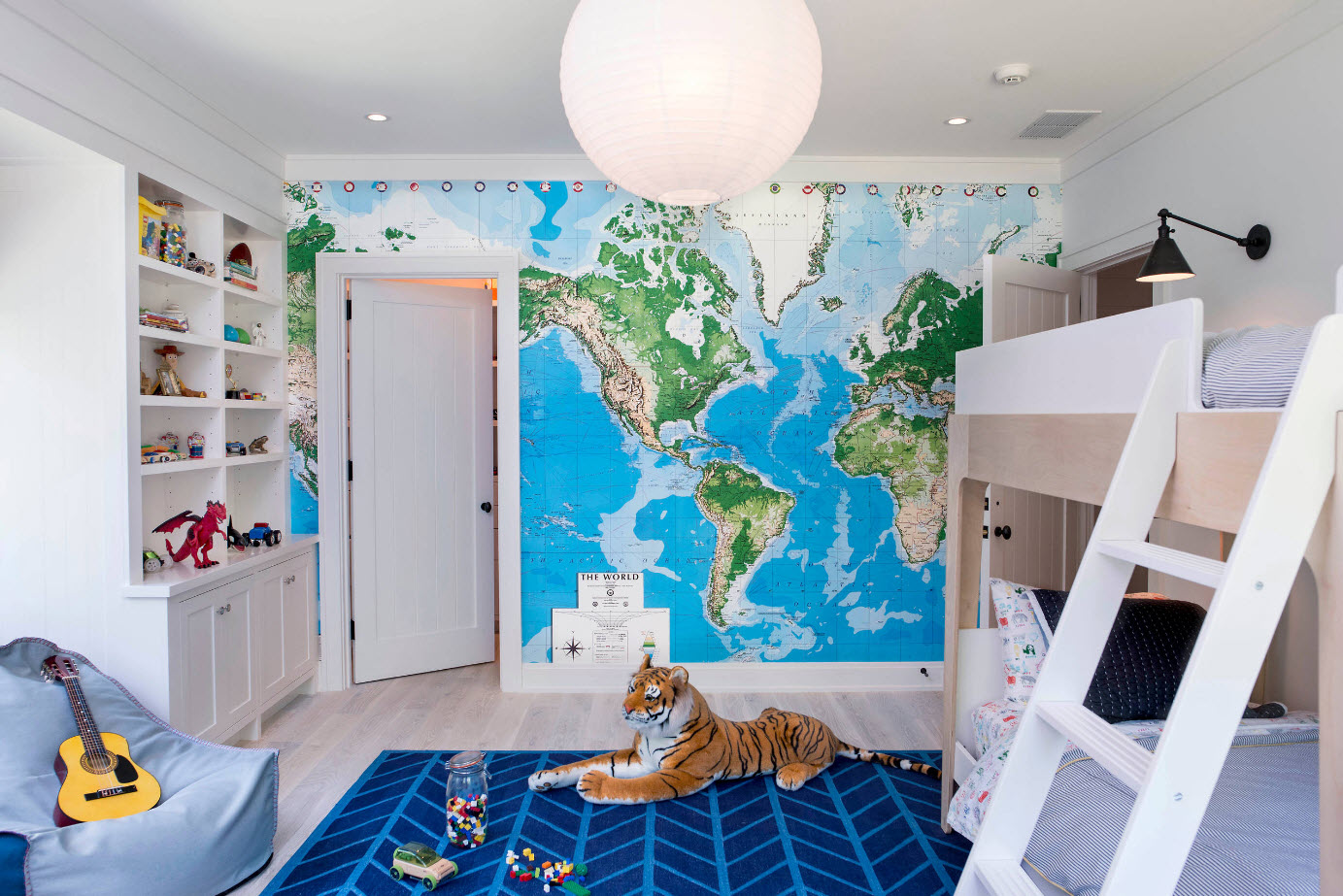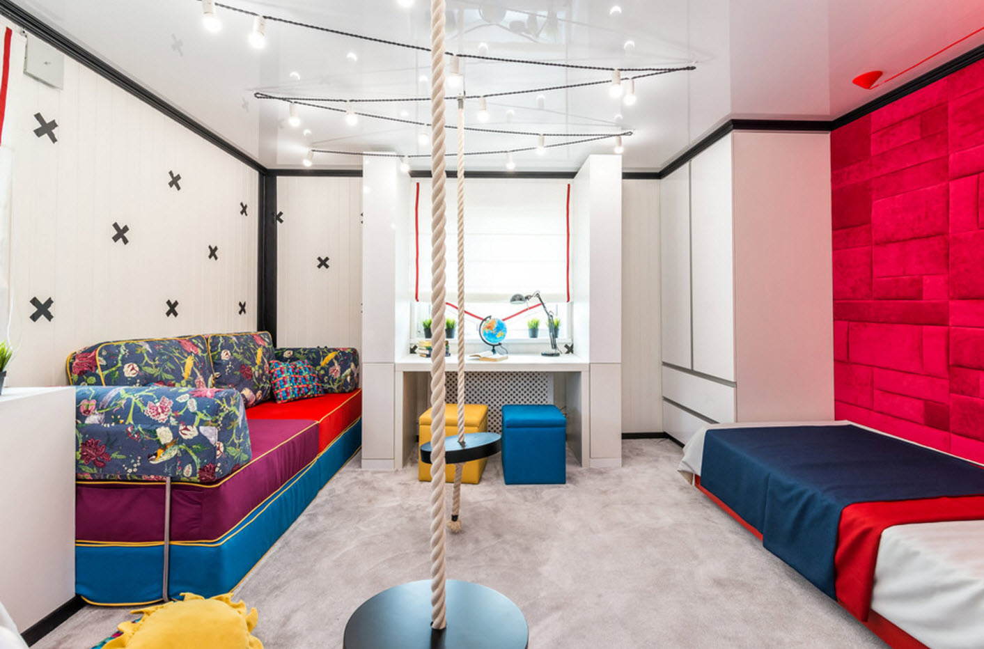 Не теряет популярность такой дизайнерский метод, как использование акцентной стены. В светлой комнате одна из вертикальных поверхностей оформляется в ярком или темном цвете. В последнее время наибольшее распространение получили тонкие магнитные полотна, на которых можно рисовать мелками, прикреплять рисунки, поделки и выражать свои творческие способности самыми разными способами. Не теряет популярности и использование фотообоев. Фотопечать с любимыми героями, сказочным пейзажем, карта мира или звездного неба – любой вариант, близки по тематике к интересам вашего ребенка станет украшением интерьера и привнесет цветовое разнообразие в светлый образ помещения.
