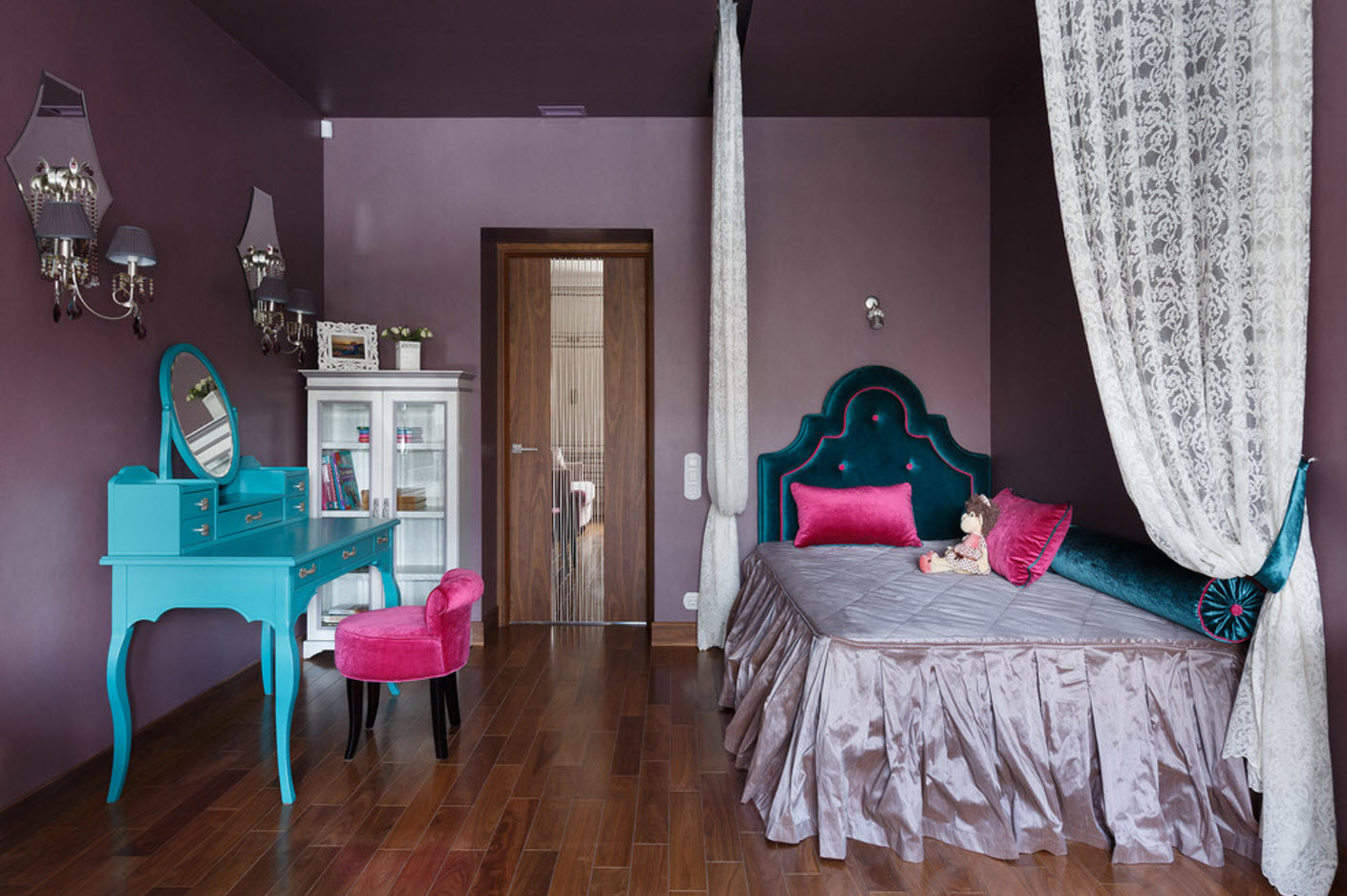 В оформлении комнаты для девочки специалисты рекомендуют особое внимание уделить текстилю. Отделка и меблировка может быть самой простой и практичной. Но именно ткани, их качество, цветовое и фактурное решение задают тон характеру помещения, указывают на утонченность и элегантность его маленькой хозяйки. Безусловно, мода на рюши и кружева не пройдет никогда. Их дозированное применение поможет создать легкий и свежий образ помещения. Но в новом сезоне дизайнеры рекомендуют обратить внимание на различные вариации плюша – бархат, велюр с разной длиной ворса могут стать залогом создания непросто девичьего интерьер, а образа помещения, в котором чувствуется королевская роскошь.