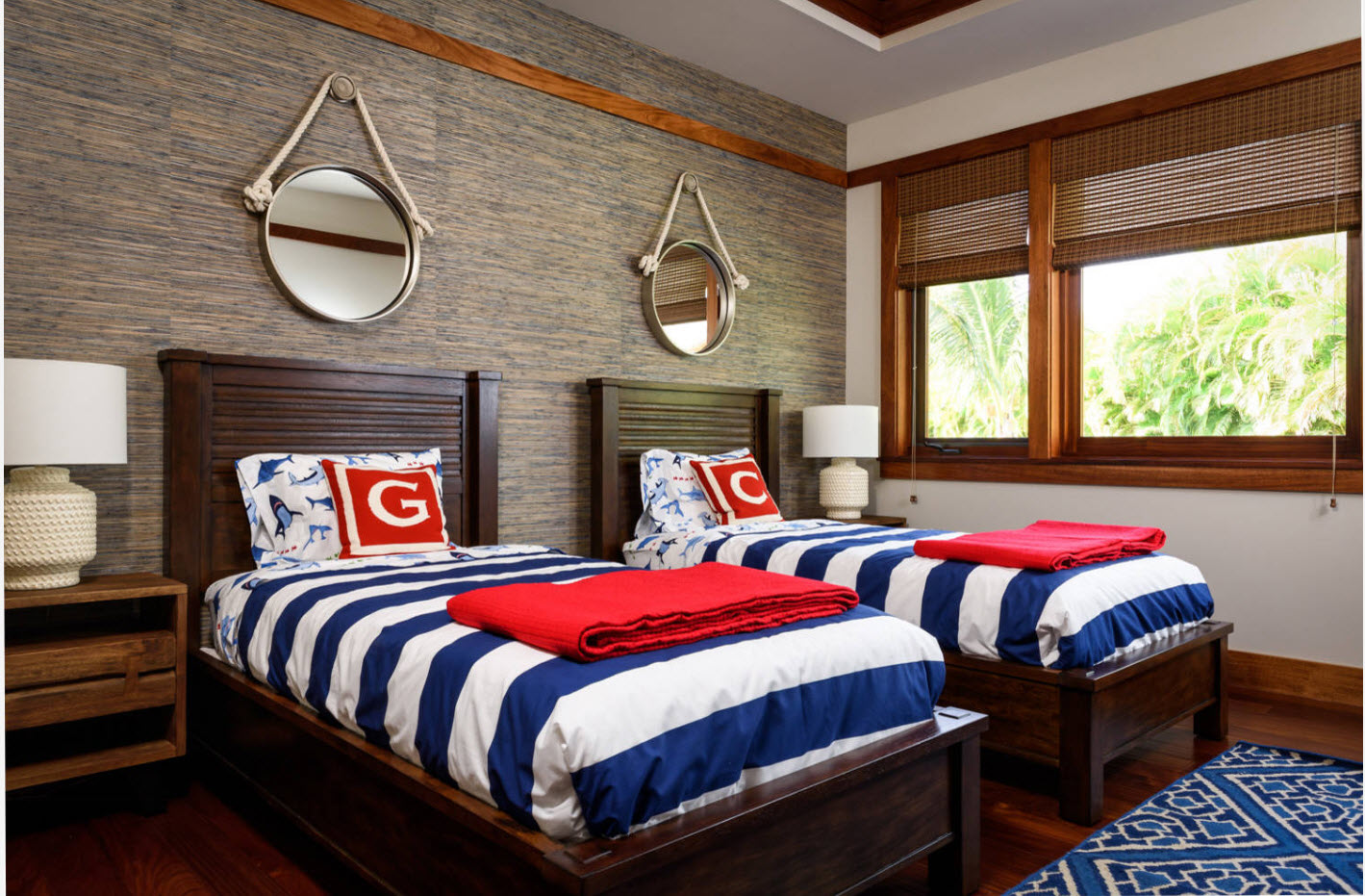 Еще одна популярная на все времена тематика для оформления мальчишечьей комнаты – морские путешествия. Нет нужды использовать синий цвет активно для отделки помещения или оформлять спальное место текстилем в бело-голубую полоску (если только сам ребенок вас об этом не попросит). Изображения якорей и штурвалов, маяков и парусников на постельном белье – колоритный штрих в создании тематического оформления. Для отделки стен можно выбрать нейтральный светло-голубой оттенок или ограничиться оформлением при помощи обоев с не пестрым принтом на морскую тематику. В любом случае цветовая температура комнаты будет достаточно прохладной. «Подогреть» оригинальный образ помогут предметы мебели или даже отделки из дерева, его природный рисунок всегда привносит теплоту в любую обстановку.