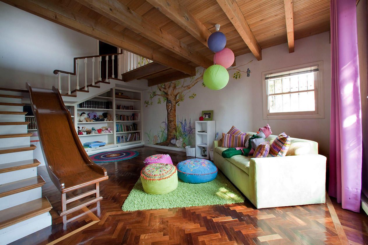 Идей для креативного и развивающего игрового детского пространства в частном доме огромное множество. Именно просторная площадь позволяет реализовать самые смелые и необычные задумки. Это и сооружение небольших домиков, шалашей, вигвамов, детских кухонь, мастерских, лабораторий для ролевых детских игр. Вполне возможно размещение небольших пластиковых мобильных горок, сухих бассейнов, качелей, гамаков, лазалок.