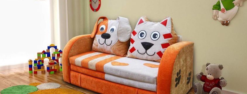 Производители мягкой мебели с учетом интересов современных детей предлагают удивительные решения дизайна. Традиционные диваны отошли на второй план, а лидирующие позиции заняли оригинальные забавные модели с ярким рисунком или в виде объемной мягкой игрушки. Впервые зайдя в комнату очень непривычно вместо классического диванчика увидеть конструкцию в виде зверька, голова которого обычно служит спинкой, а лапки – подлокотниками. Нередко встречаются имитации автомобилей, паровозов, автобусов, пароходов, лесных хижин, домиков Золушки хижины и пр.