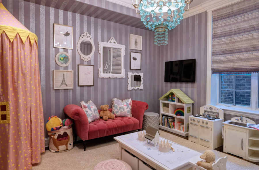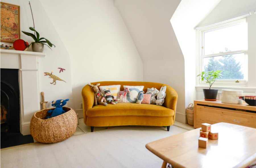 Если в спальне для взрослых мы устанавливаем у изножья кровати небольшую оттоманку, то в детской комнате ее место может занять компактный диванчик. Присев на такой диванчик, ребенку будет удобнее одеваться и обуваться.