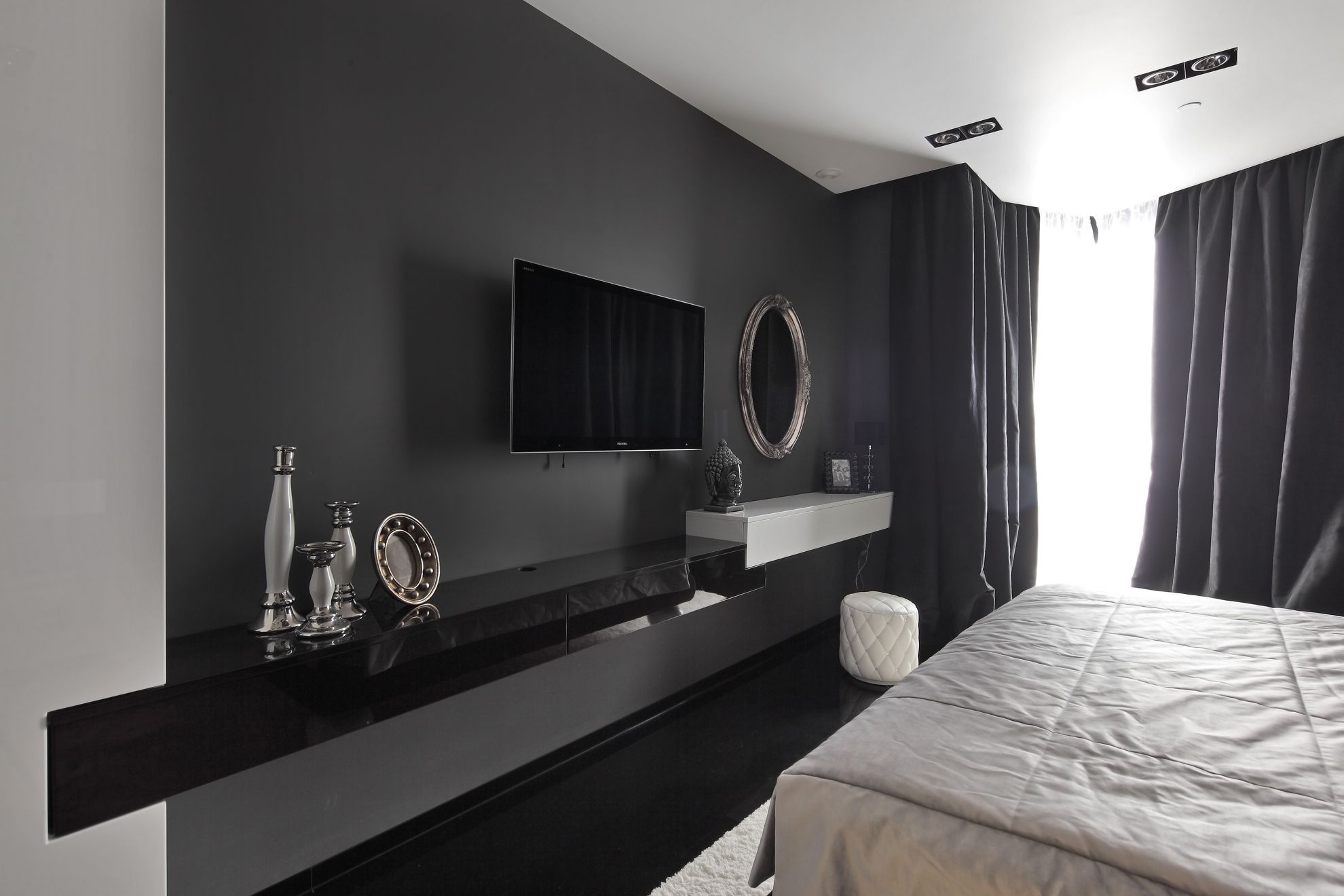 Не смотря на статус «классического» чёрный цвет является обладателем довольно непростого характера. Он одновременно завораживает своей глубиной и подавляет окружающие его оттенки. Поэтому не каждый хозяин решится использовать его в качестве основного при создании интерьера. Однако если грамотно применить в дизайне сдержанность чёрного цвета и его умение создавать спокойную атмосферу, можно создать элегантное и изысканно оформленное пространство даже в спальне. Такое интерьерное решение смотрится по-особенному красиво и обладает магической атмосферой.