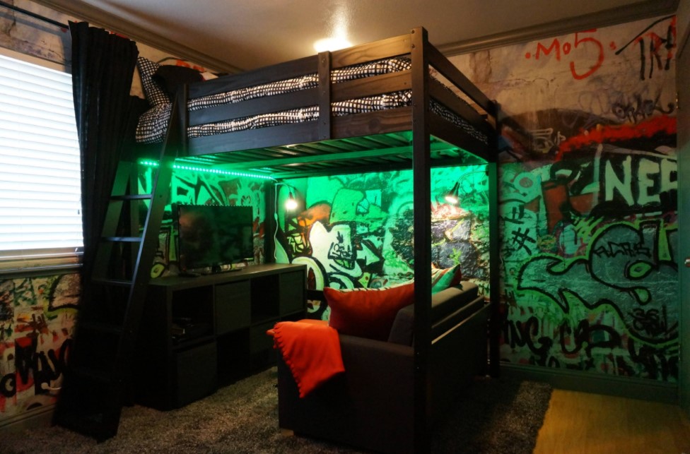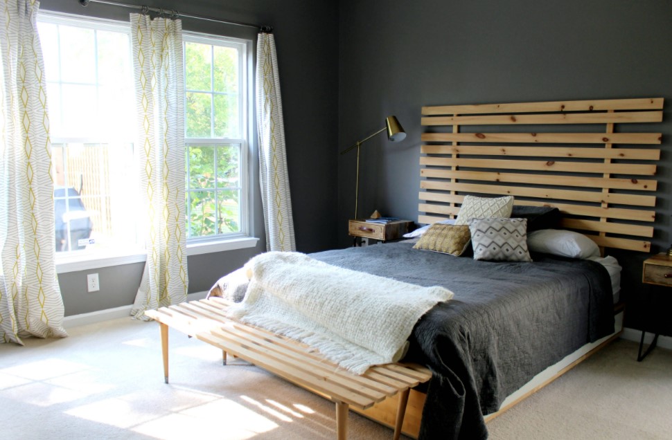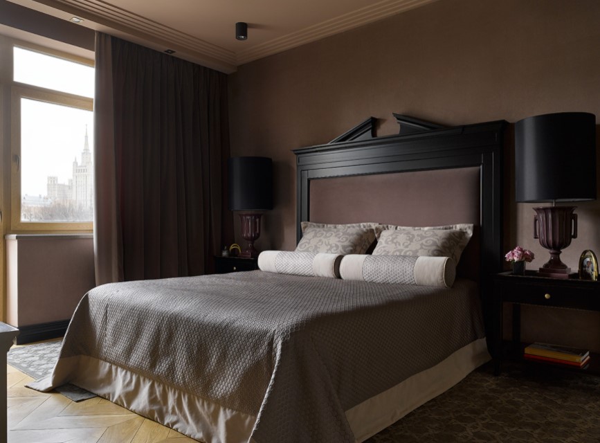 - Также необходимо учитывать уровень естественного освещения комнаты. Для спальни, оконные проёмы которой выходят на юг или восток, столь глубокий тёмный оттенок позволит в некотором роде уменьшить наполнение помещения солнечным светом. Спальня с окнами на северной либо западной стороне, наоборот, нуждается в дополнительных источниках освещения.