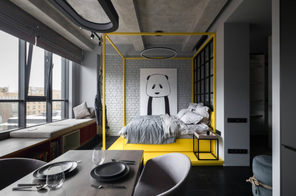Поскольку тёмные цвета способны визуально уменьшать площадь помещений, при выборе цветового дополнения к чёрному в интерьере спальни очень часто используется серый. Такое решение смотрится более лаконично и не так мрачно, как, например, оформление в чёрном цвете. Главное правильно дополнить серо-чёрный тандем другими оттенками. Среди актуальных стилевых решений классика, хай-тек или модерн.