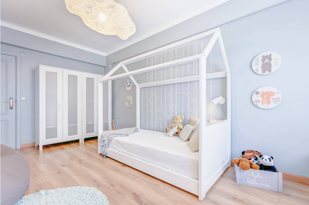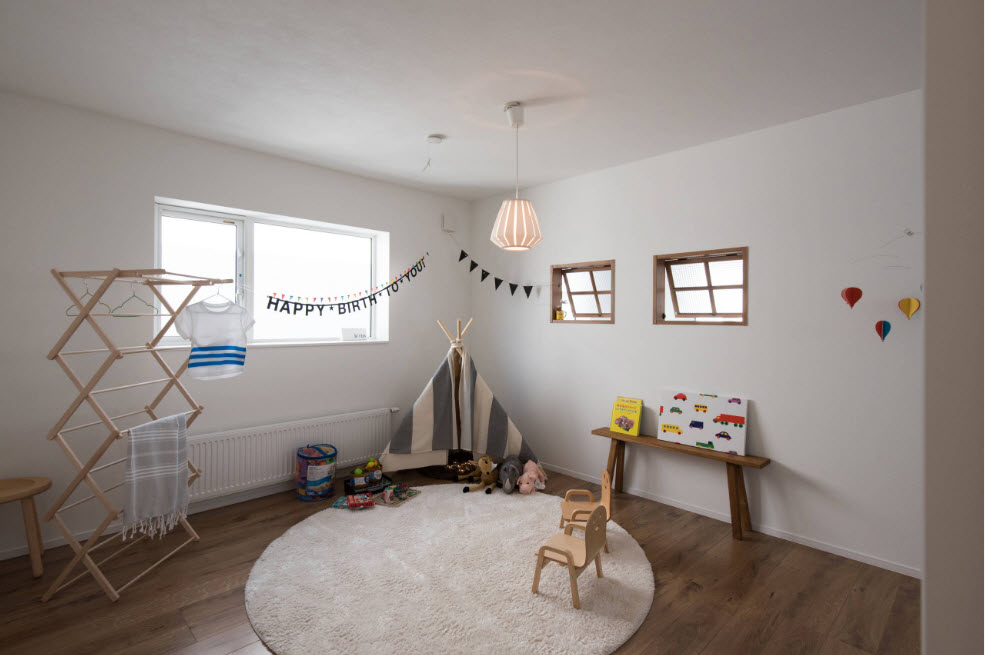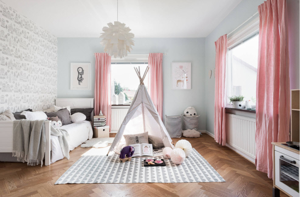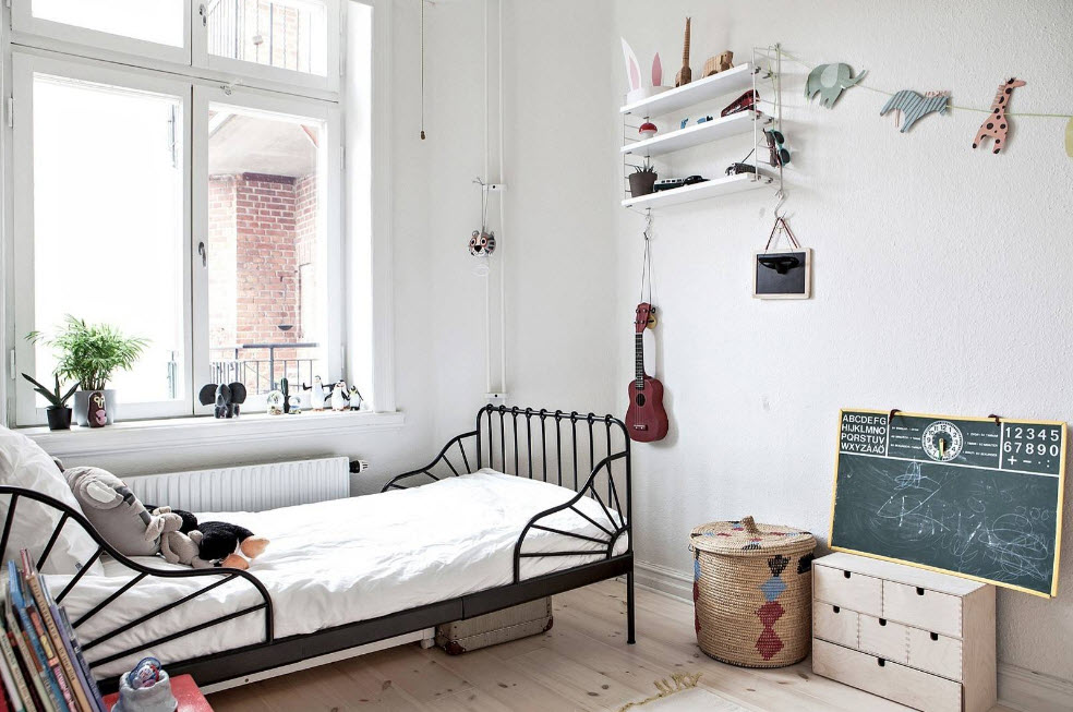 Детская комната, оформленная по принципам дизайн стран Северной Европы, простота и лаконична, но при этом уютна и комфортна. Обилие белого цвета (в основном за счет отделки стен и потолка) позволяет использовать скандинавские мотивы даже в малогабаритных помещениях. Достаточно прохладную палитру «разбавляет» присутствие предметов интерьера из натуральной древесины (мебель, напольное покрытие, элементы отделки стен или потолка). Теплота и уют обстановки достигается за счет использования текстиля из натуральных тканей (хлопок, лен, шерсть), декоративных элементов часто сделанных своими руками или на заказ, живых растений.