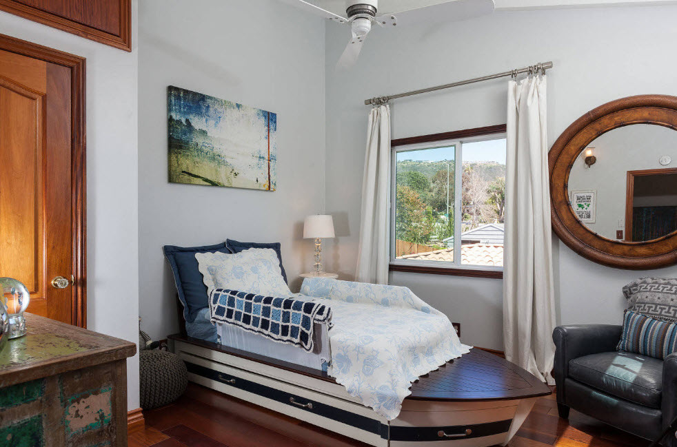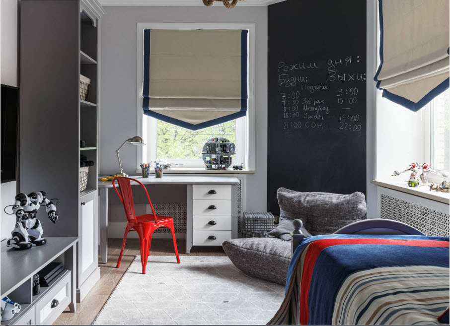 Так уж сложилось, что мальчики априори активнее и подвижнее девочек, для выхода их неуемной энергии необходимо всегда иметь запас свободного пространства. Именно поэтому в комнате мальчика родителям необходимо создать обстановку, в которой большая часть комнаты останется свободной или будет занята спортивным комплексом. Безусловно, все дети разные и, возможно, именно ваш малыш любит спокойные игры или ему хватает активности, которую он проявляет во время прогулки. Но большинство мальчиков остро нуждаются по вечерам в сбросе накопленной за день энергии. Если говорить о выборе тематического оформления детской комнаты, то все зависит от интересов вашего мальчика. Наиболее часто используется морская тематика, космос, тема путешествий или за основу берутся изображения любимых героев мультфильмов, сказок, комиксов.