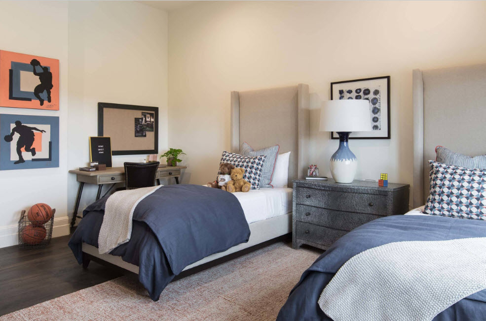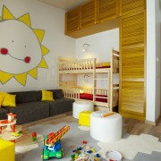 Одна из особенностей детской комнаты связано с большим набором функций, которые она выполняет. Зонирование такого многопрофильного пространства неизбежно, ведь необходимо выделить не только сегмент для сна и отдыха, но и обозначить место для занятий учебой и творчеством, в некоторых комнатах необходима спортивная (активная) зона. Но это не значит, что зонировать функциональные сегменты необходимо явно, при помощи перегородок, ширм и шторок. Современный дизайна как раз старается отойти от любого ограничения пространства и создания препятствий для прохождения воздуха и света. Зонирование имеет весьма условный характер – при помощи мебели, отделки поверхностей, осветительных приборов или коврового покрытия.