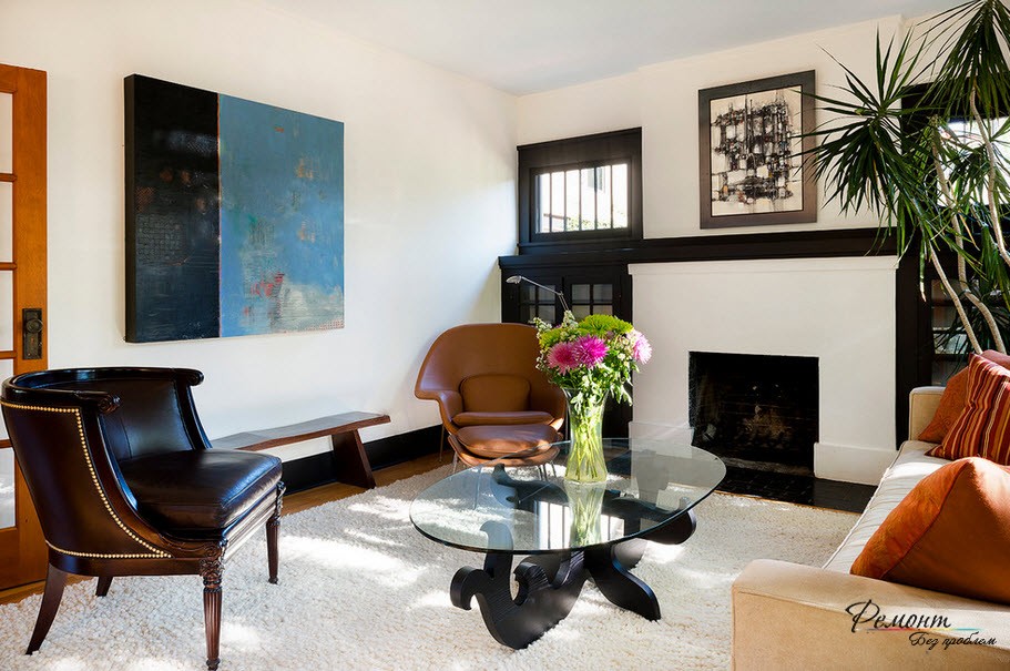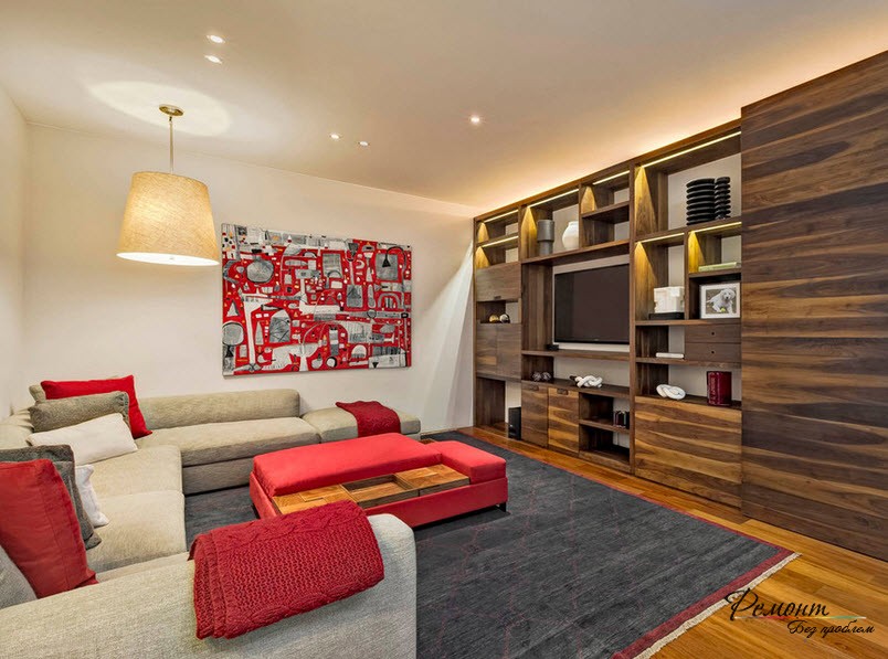 Есть и другое использование цветовых контрастов. Например, стены и диван светлые, а ковер и остальная мебель темные. При этом на диване лежат подушки в тон ковру и даже картине на стене. Такое сочетание цветов всегда выглядит красиво, заманчиво и гармонично.
