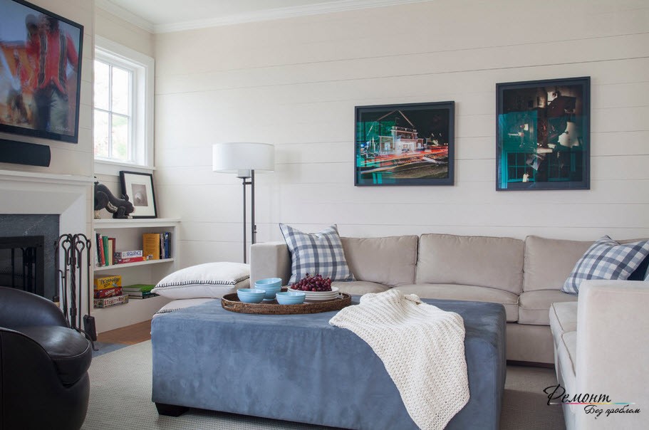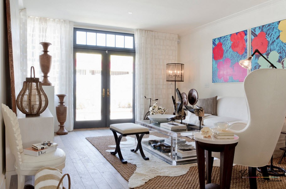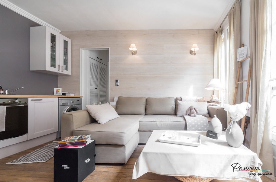 В отношении стен можно сказать, что узорчатые, темные или яркие обои их явно испортят, придав гостиной четкие границы. Здесь хорошо будет смотреться нечто однотонное в светлых тонах: белый, кремовый, молочный, жемчужный, лавандовый, персиковый, бежевый, цвет кофе с молоком, песочный и так далее. Почему именно светлые тона? Потому что именно так можно придать комнате ощущение простора, легкости и визуально увеличить ее размер. К тому же такие цвета размоют границы помещения, сделают его объемнее и глубже.