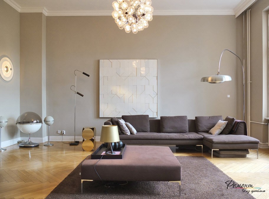 В дизайне подобных комнат пол имеет большое значение. Многие специалисты сходятся во мнении, что здесь лучше использовать однородное и однотонное покрытие. Для того чтобы пространство гостиной объединялось со смежными комнатами по стилю, для стен этих самых смежных комнат лучше подобрать такой же цвет, что и для пола гостиной.