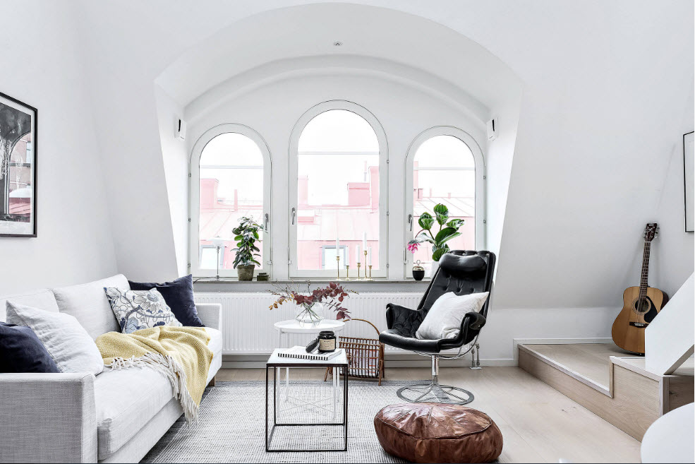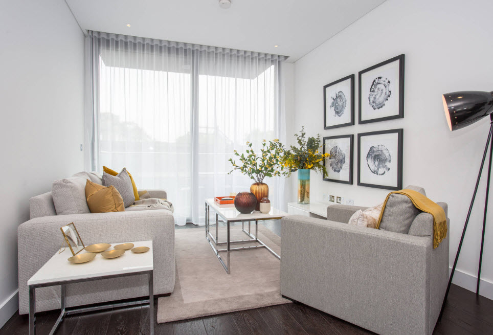 Итак, для малогабаритной комнаты лучше выбрать современный стиль, тяготеющий к так называемому «комфортному минимализму» – только необходимый набор мебели и аксессуаров, но при этом обстановку нельзя назвать аскетичной, она наполнена домашним теплом и уютом. Что касается цветовых решений, то, очевидно, что базовым тоном необходимо выбрать светлый (чаще всего белый) цвет. А вот на фоне стелой отделки уже можно располагать яркий акцент (как правило, один крупный предмет) и разбавлять обстановку нейтральными по тону элементами – серыми, бежевыми, цвета любой породы древесины.