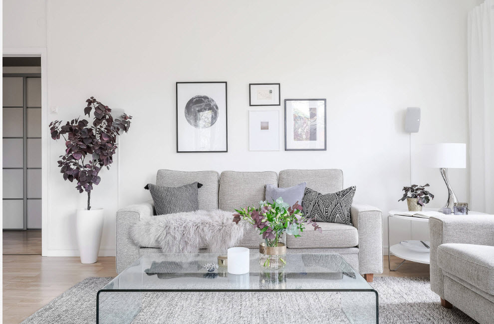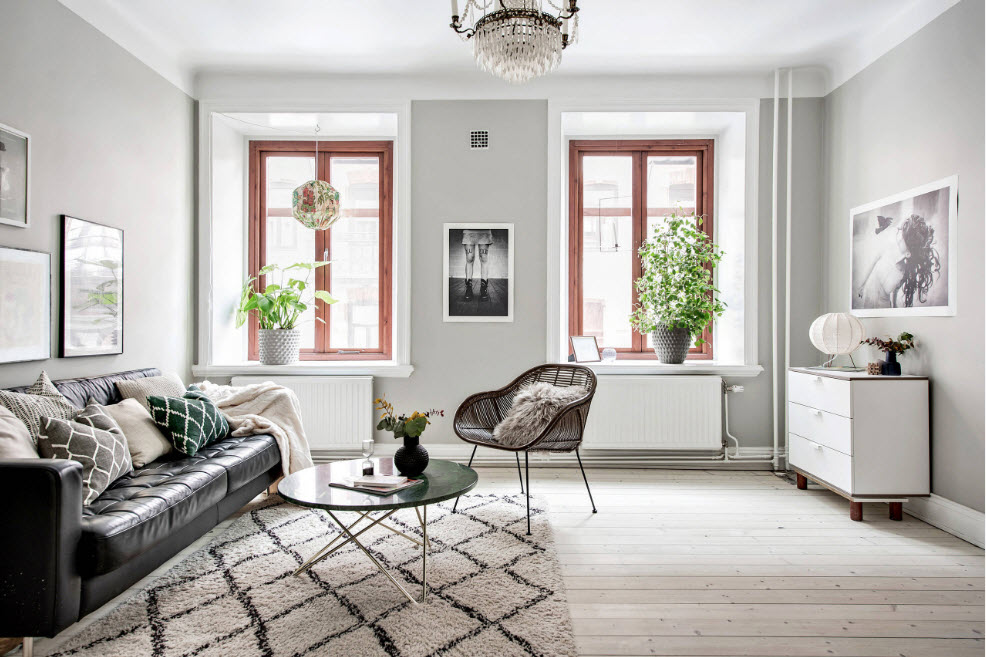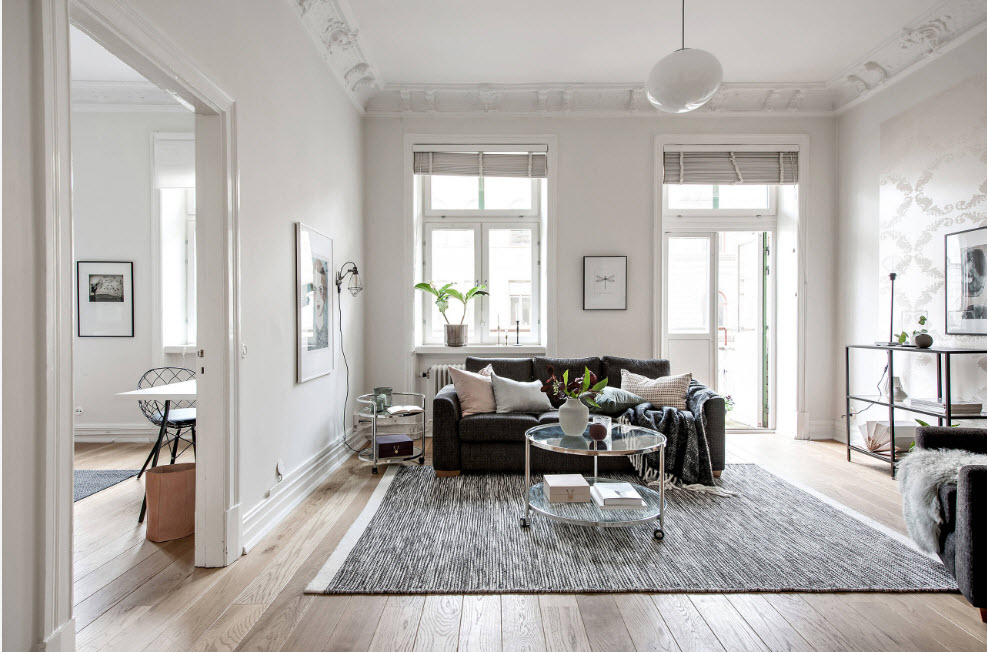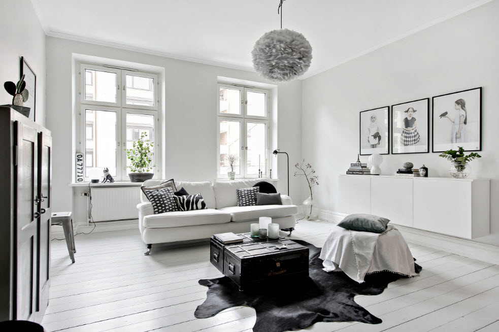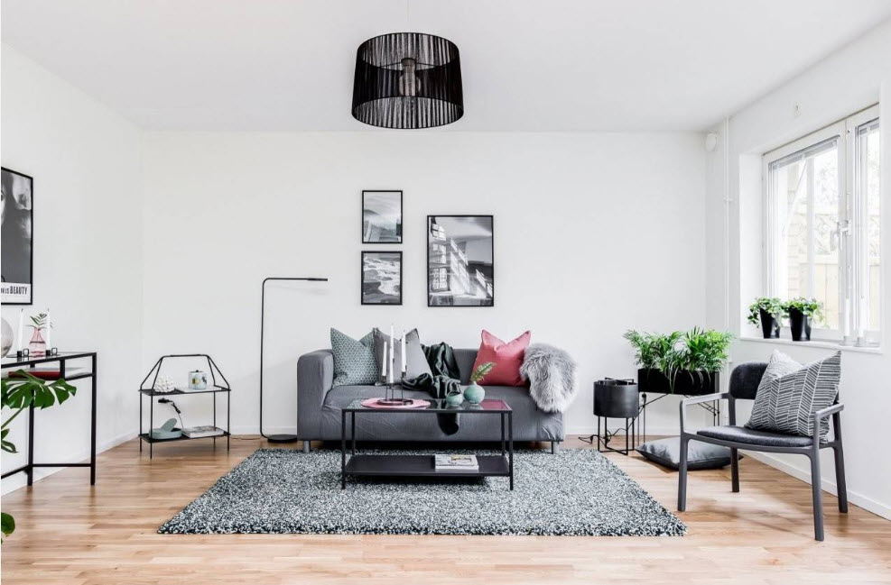 Широкое использование белого цвета в качестве базы при оформлении гостиной (чаще всего в качестве тона отделки стен) связано еще и с широкой популярностью скандинавских мотивов. Можно смело утверждать, что скандинавская стилистика зиждется на использовании белого цвета в качестве базисного, различных оттенков серого в качестве вспомогательного, разбавленного деревянными поверхностями. На таком нейтральном фоне особенно эффектно смотрятся небольшие вкрапления яркого цвета – это может быть текстиль, небольшое количество декора или живые растения.
