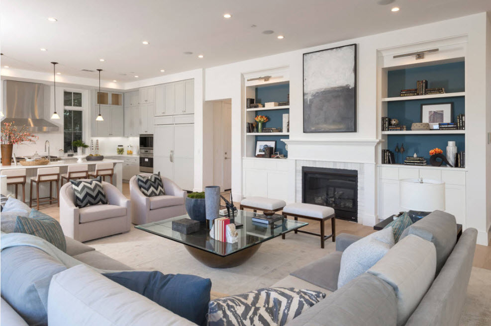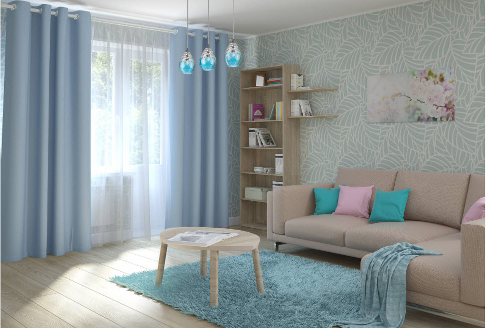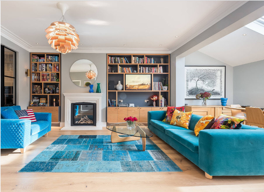 Если говорить о трендах, связанных с цветовыми решениями для оформления гостиных, то безусловным лидером становится использование прохладной палитры. Различные оттенки синего, серого, зеленого и фиолетового цветов активно используются в качестве вспомогательных цветовых решений. Например, ярко-синяя велюровая обивка дивана на светлом фоне отделки гостиной будет смотреться более чем эффектно.