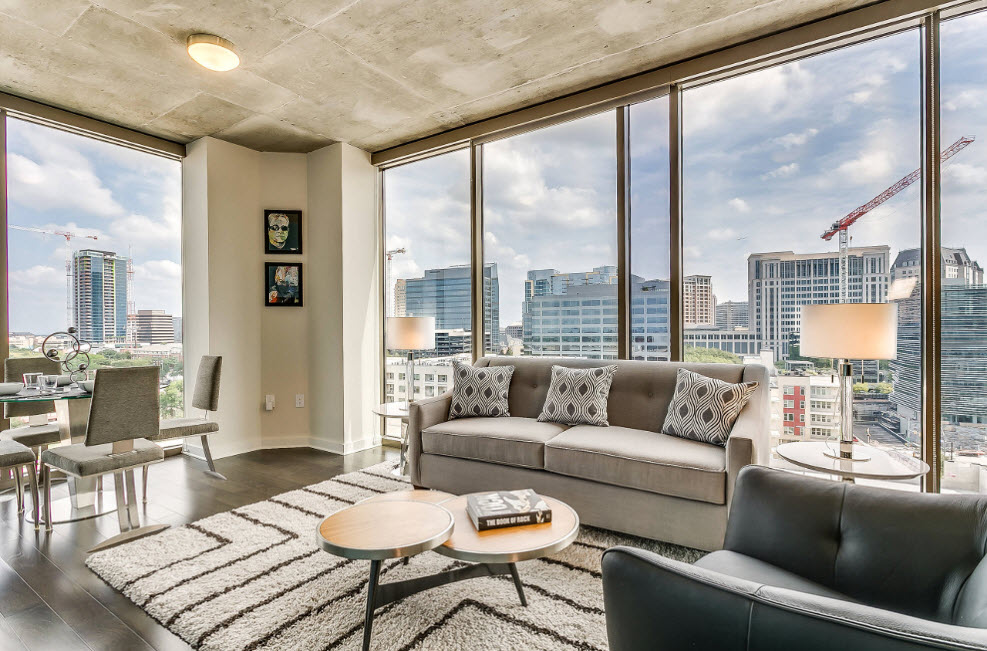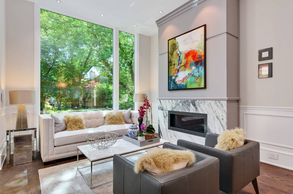 - современная гостиная представляет собой просторное и светлое помещение, приветствуется установка панорамных окон, обеспечивающих максимальную естественную освещенность. В небольших помещениях большие окна помогут создать иллюзию увеличения площади. Для малогабаритных жилищ дизайнеры рекомендуют прибегнуть к объединению маленькой гостиной со смежными помещениями (кухней, коридором или прихожей) для создания просторной студии;
