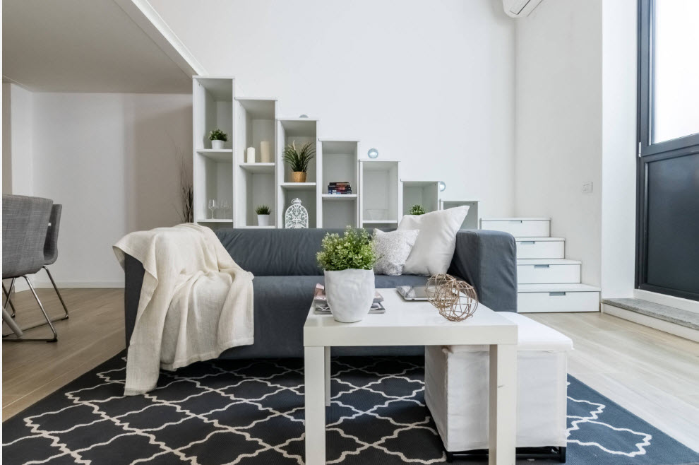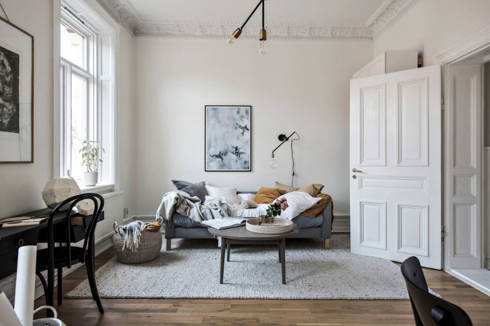 - для сохранения ощущения простора и свободы даже в небольших комнатах необходимо не загромождать пространство излишней мебелью и декором. Принцип «комфортабельного минимализма» актуален и по сей день. Лучше использовать минимальный набор меблировки, а в качестве декоративных элементов могут выступать и вполне практичные предметы интерьера – осветительные приборы, зеркала и рамы к ним, часы, небольшая мебель (кофейные столики, этажерки, пуфы и различные подставки);