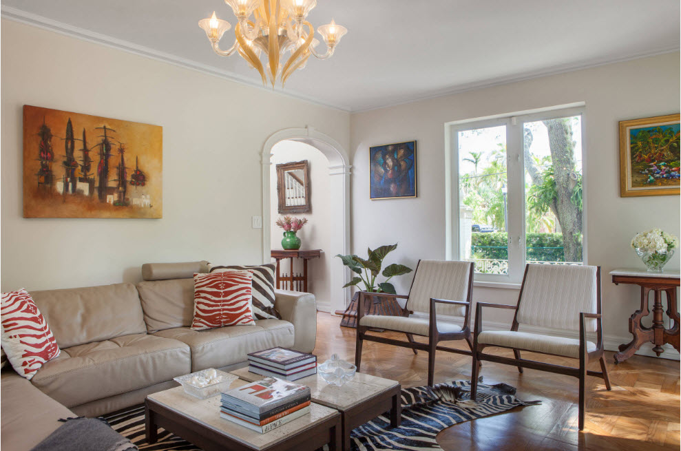 Дело в том, что эти цвета и широкую палитру их оттенков несложно сочетать с более яркими, колоритными решениями. На фоне светлых тонов эффектно смотрится древесина любой породы и яркие акценты меблировки или текстиля. Даже начинающему дизайнеру под силу создать уникальный, но при этом практичный проект оформления гостиной, который будет по карману большому количеству россиян.
