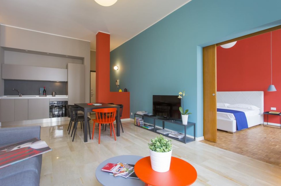 Можно выбрать для отделки декоративную штукатурку с последующей покраской зон спальни-гостиной красками различных оттенков.