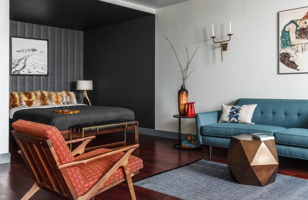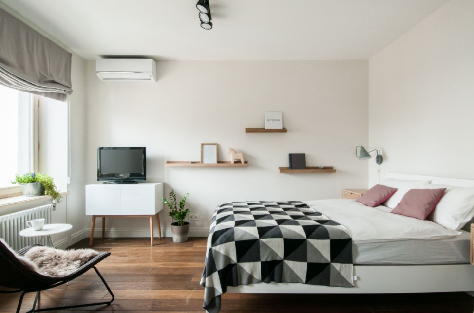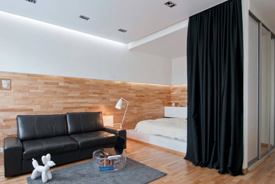 Самые простой вариант зонирования и дизайна интерьера квартиры с одной жилой комнатой доступен для владельцев «однушки» с нишей. Именно в нише удобно размещается спальная кровать. Если же такой зоны в планировке не предусмотрено зонируем самостоятельно. Рассмотрим самые распространенные, доступные и эргономичные версии.