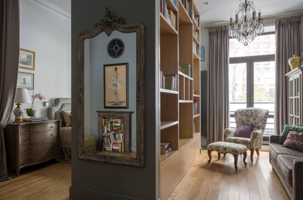 Разделение комнаты на гостиную и спальню с помощью зеркального шкафа-купе – отличный вариант зонирования, который предоставляет нам отличную и вместительную систему хранения вещей, большие зеркала, используемые не только по прямому назначению, но и для визуального расширения пространства.