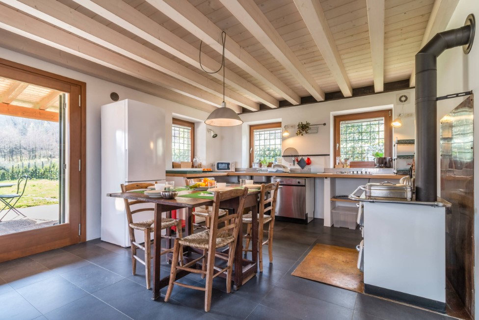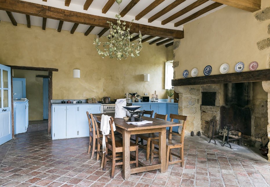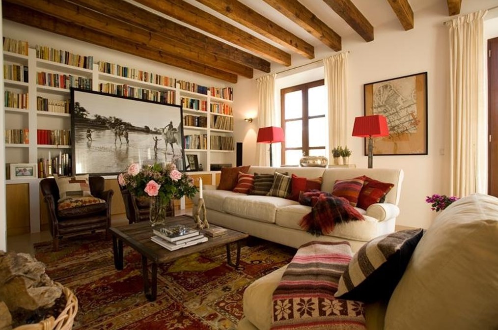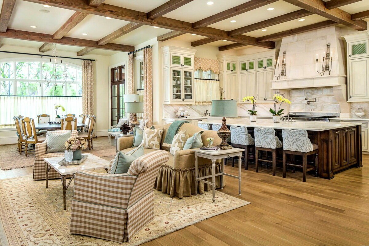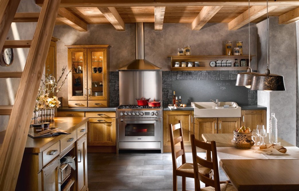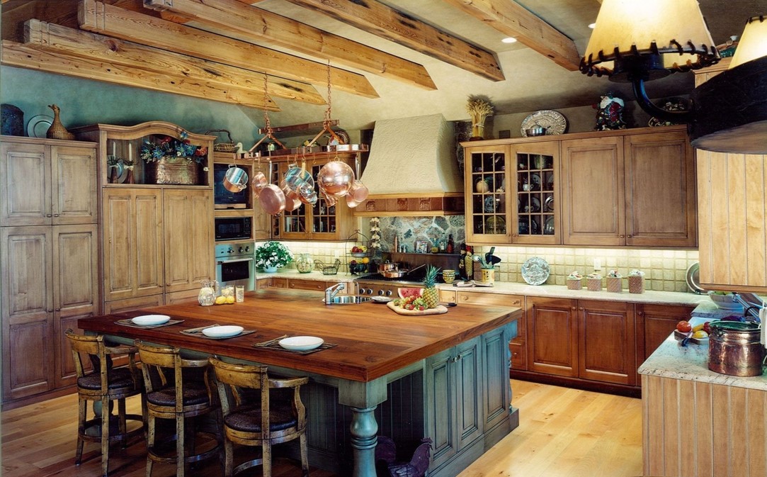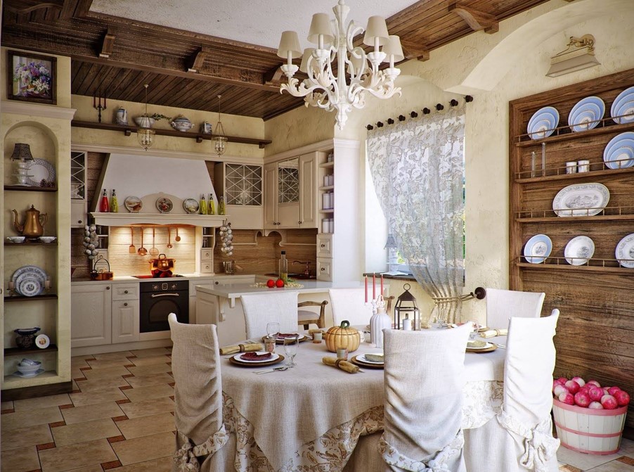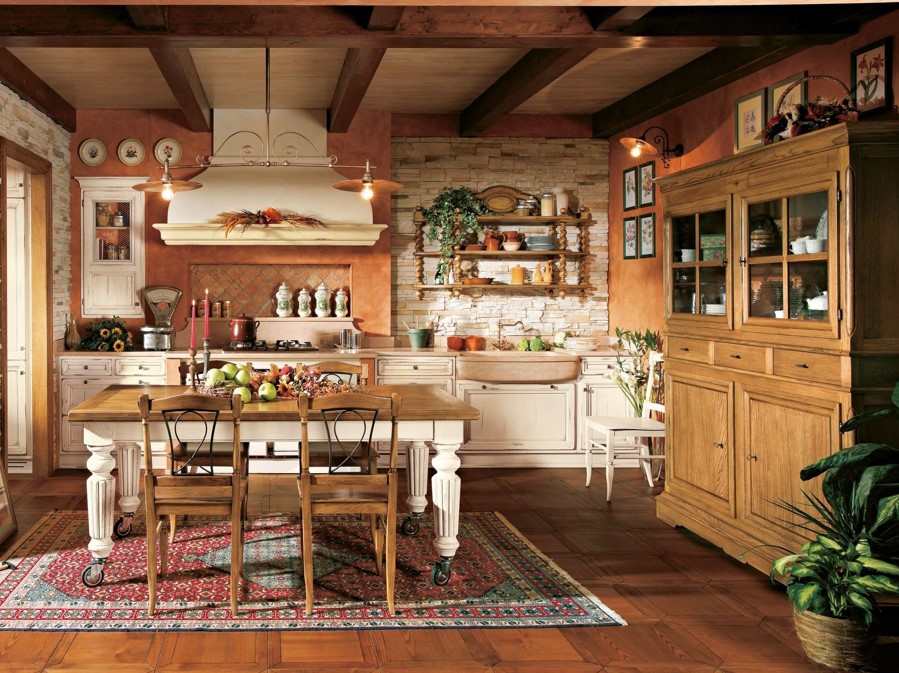 Этот стиль родом из Италии и имеет второе название – тосканский – одноименная историческая местность в этой стране. Жители средиземноморского региона в этом стиле традиционно оформляют свои дома из белого кирпича. Иногда тосканский интерьер можно встретить и в деревянных строениях, причем в самых разных уголках мира. Для выполнения этого дизайна Вам понадобятся: деревянные балки для отделки потолка, цветная керамическая плитка для отделки кухонных поверхностей, древесный массив для пола в едином цвете и фактуре, роскошные заниженные светильники, простые покрывала для мягкой мебели с растительным или цветочным орнаментом, красивые, с рюшами шторы.