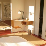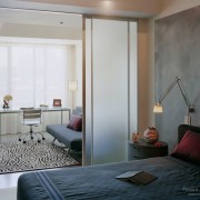 Рабочая зона располагается в дальнем углу и отделяется от зоны отдыха с помощью полупрозрачных ширм, сквозных шкафов, штор или панелей. Рабочая зона не должна находиться между входом и окном, поэтому её нужно расположить в углу. Расстояние между рабочей зоной и окном занимает больше площади и в нем располагается зона отдыха.