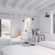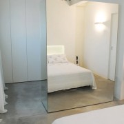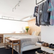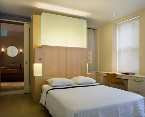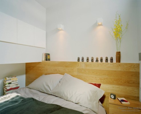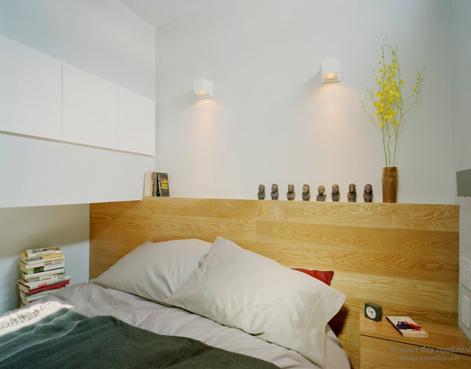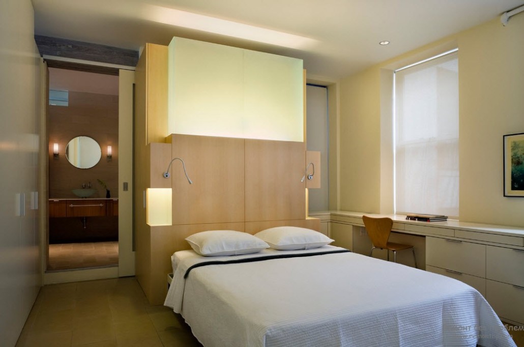 - Мебель всегда выбирается под плоскость: столы и кровати занижены к полу, шкафы вытянуты и замаскированы под стены.